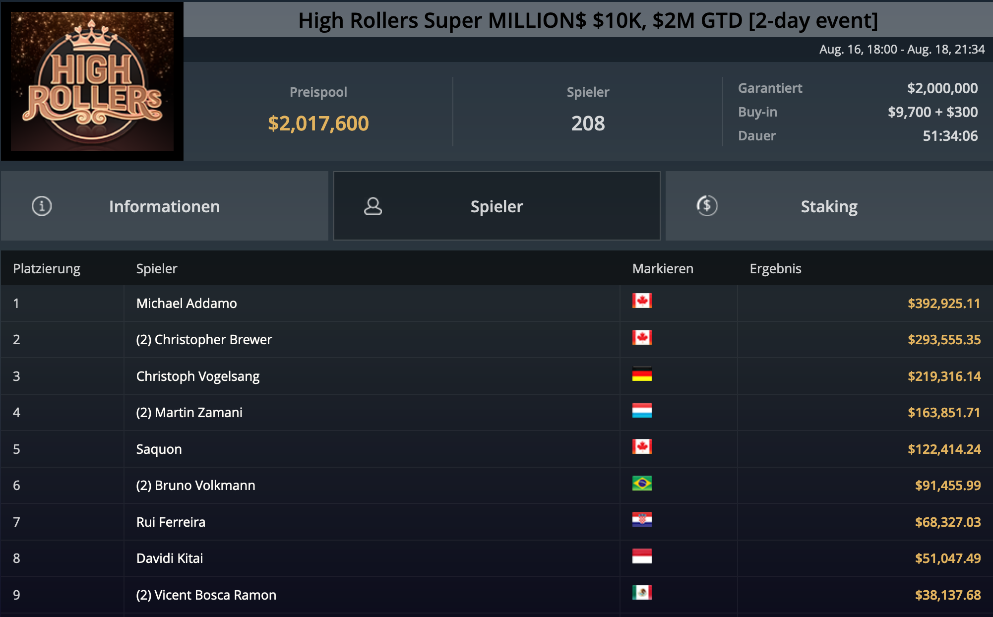 Christoph Vogelsang, der als Chipleader ins Finale des Turniers einstieg, musste sich am Ende auf Rang 3 aus dem Turnier verabschieden. Für Vogelsang gibt es dafür $219.316.