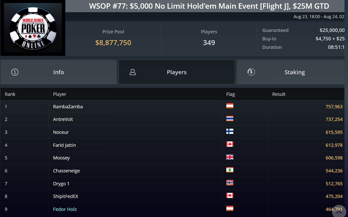 RambaZamba aus Österreich sicherte sich Starttag 1J, wo Fedor Holz Neunter wurde, und Ben Rolle landete bei Flight I auf dem dritten Platz.