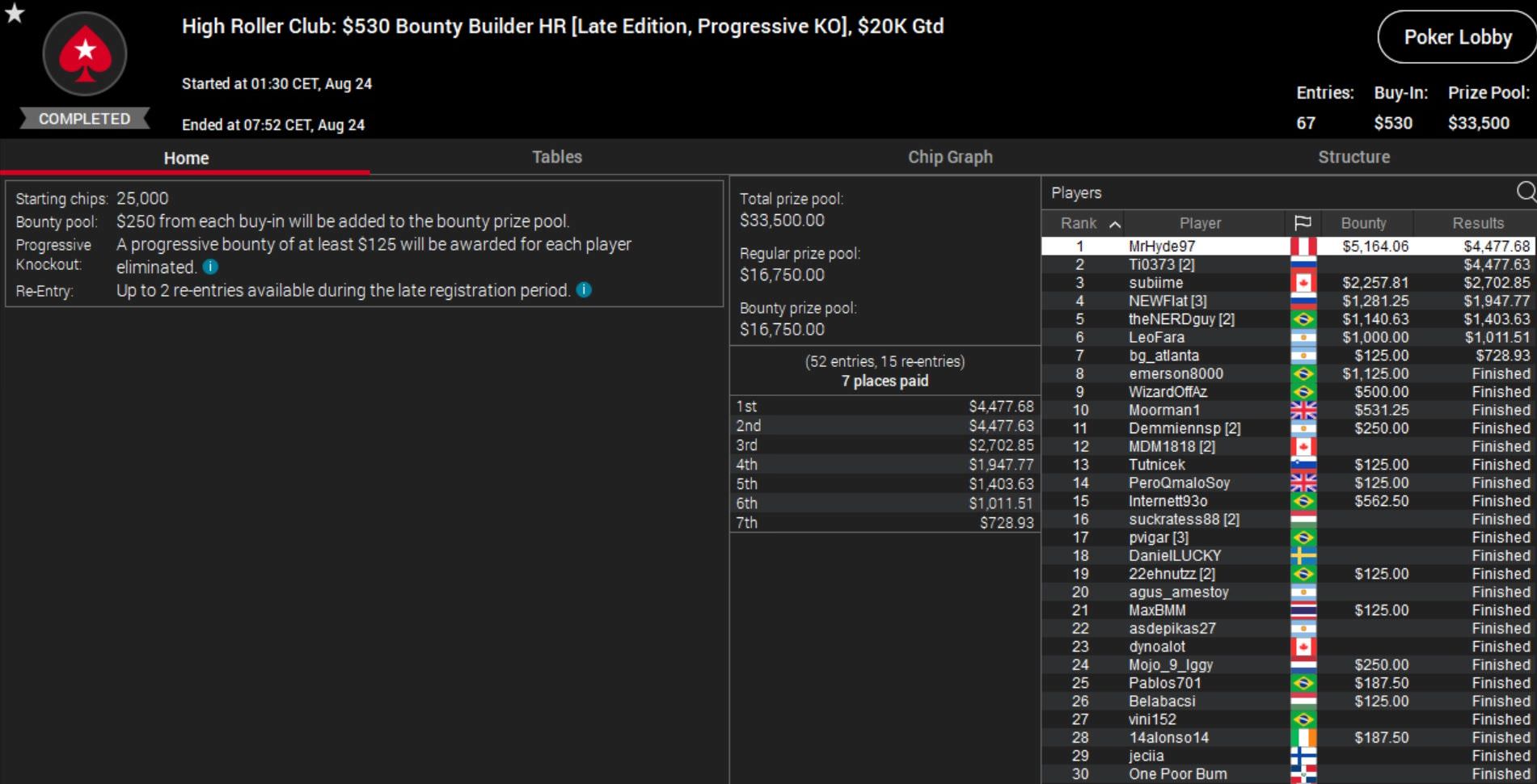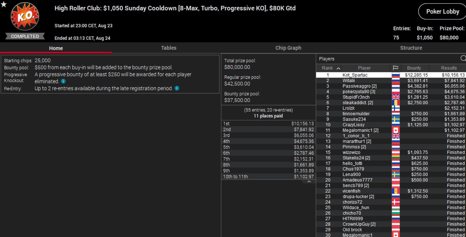 Weitere Siege gingen an Andrey „Kot_Spartac“ Kotelnikov beim $1.050 Cooldown, Simon „C. Darwin2“ Mattsson beim $1.050 Supersonic und den Peruaner „MrHyde97“ bei der $530 Bounty Builder Late Edition.