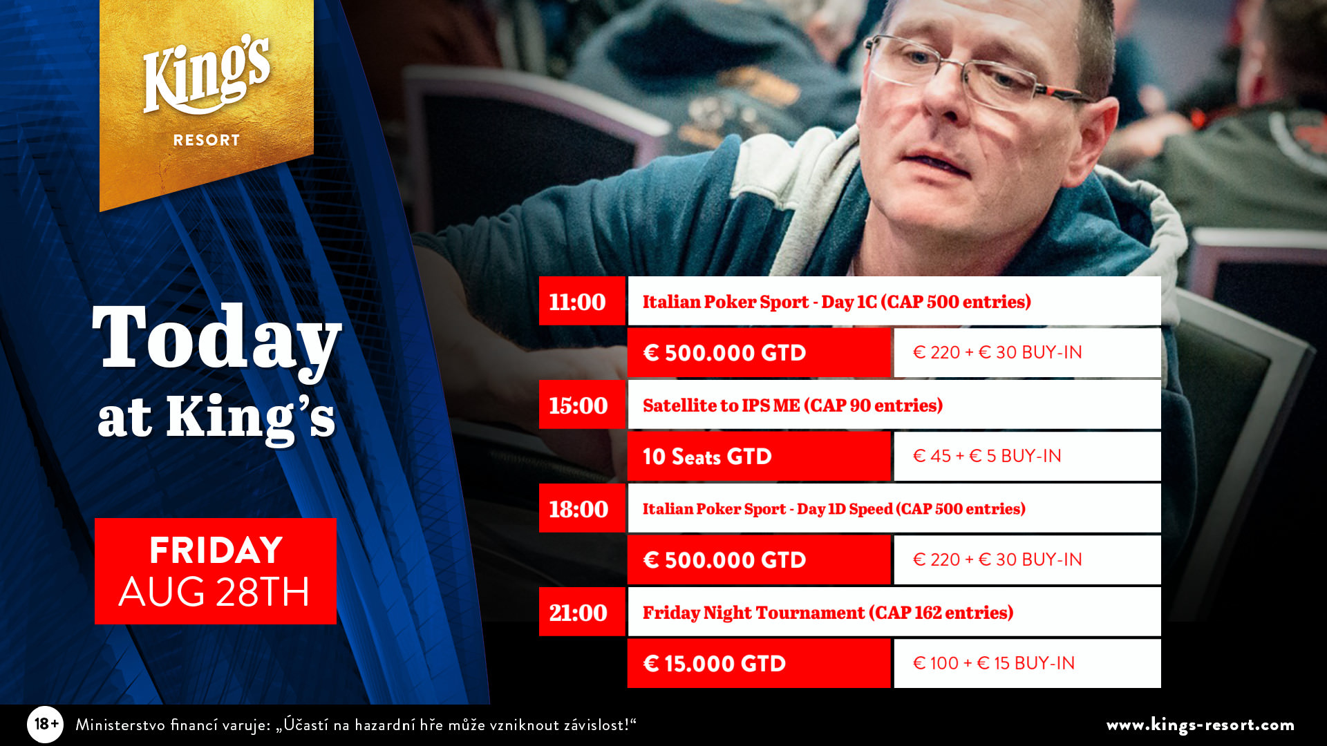 Am Freitag geht es im King’s um 11:00 Uhr mit dem Tag 1c des €220+€30 Italian Poker Sport (IPS) Main Event weiter. Bei dem Turnier geht es um ein garantiertes Preisgeld von €500.000 (inklusive fünf €10.350 WSOP Europe Main Event Tag 1a Tickets). Beim dritten von insgesamt sieben Starttagen Eins geht es mit 50.000 in Chips los und es werden 16 Levels à 40 Minuten gespielt. Zwei Re-Entries sind pro Starttag erlaubt und die Late-Registration ist bis zum Start von Level 11 geöffnet. Das CAP beim Tag 1c liegt bei 500 Entries.