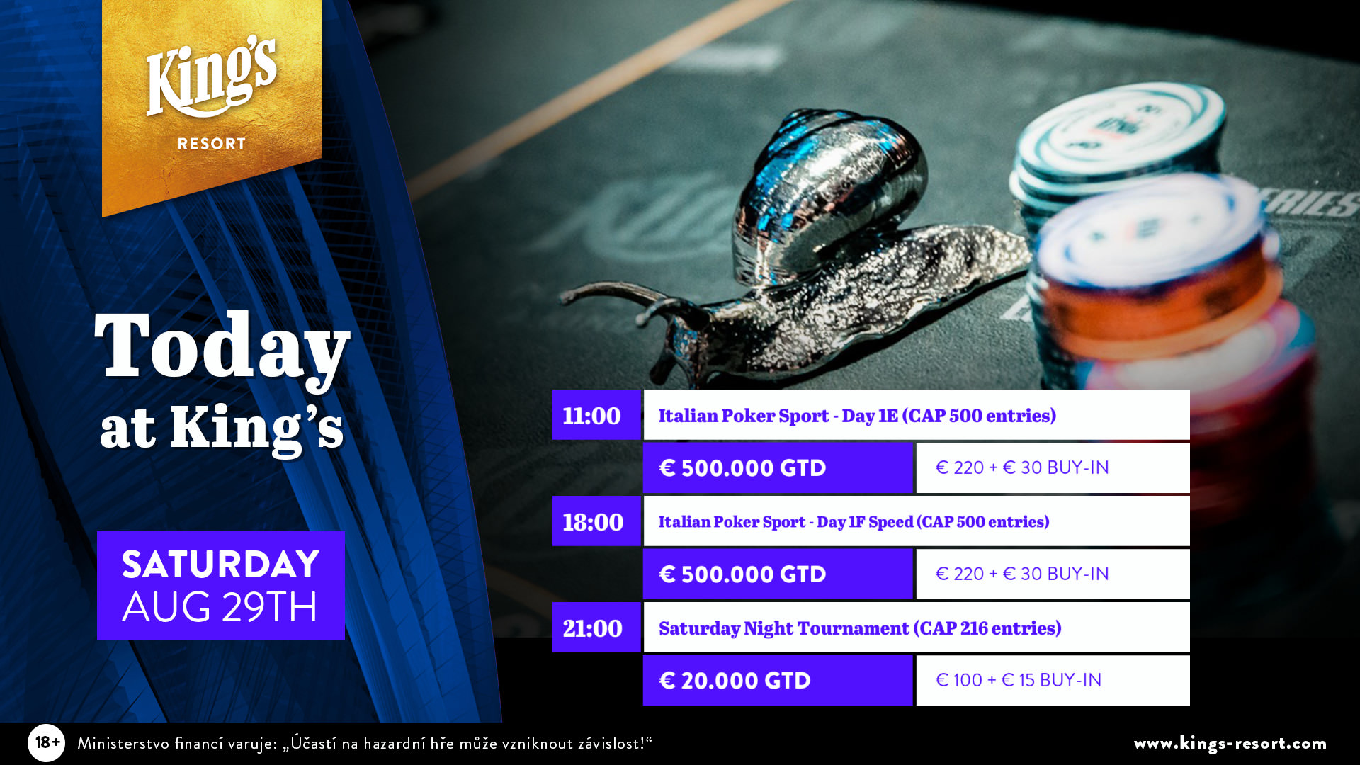 Heute stehen im King’s Resort zunächst die Starttage 1E (11 Uhr) und 1F (18 Uhr) auf dem Spielplan, am Abend um 21 Uhr wartet dann wieder das Saturday Night Tournament €20.000 GTD für das maximal 216 Entries zugelassen sind.