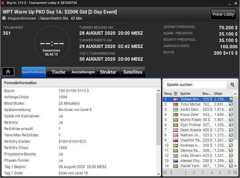 Für das $215 Warm Up PKO mit $200.000 GTD meldeten gestern 351 Teilnehmer, sodass bei noch zwei ausstehenden Starttagen bereits $70.200 eingespielt sind. Die Führung im Chipcount hat sich der Däne Torben Sörenssen erspielt, der zwar nur einen Spieler eliminieren, dafür aber 2.159.198 Chips einsammeln konnte. Der Deutsche Timo Michel bringt es auch acht Knockouts und beendete Tag 1A mit 2.091.221 Chips auf Platz zwei. Sehr gut lief es zudem für Klaus Zeiler, der fünf Spieler aus dem Turnier nehmen konnte und mit 1.640.985 Chips auf Platz vier liegt. Insgesamt haben 43 Pokerspieler den zweiten Spieltag erreicht.