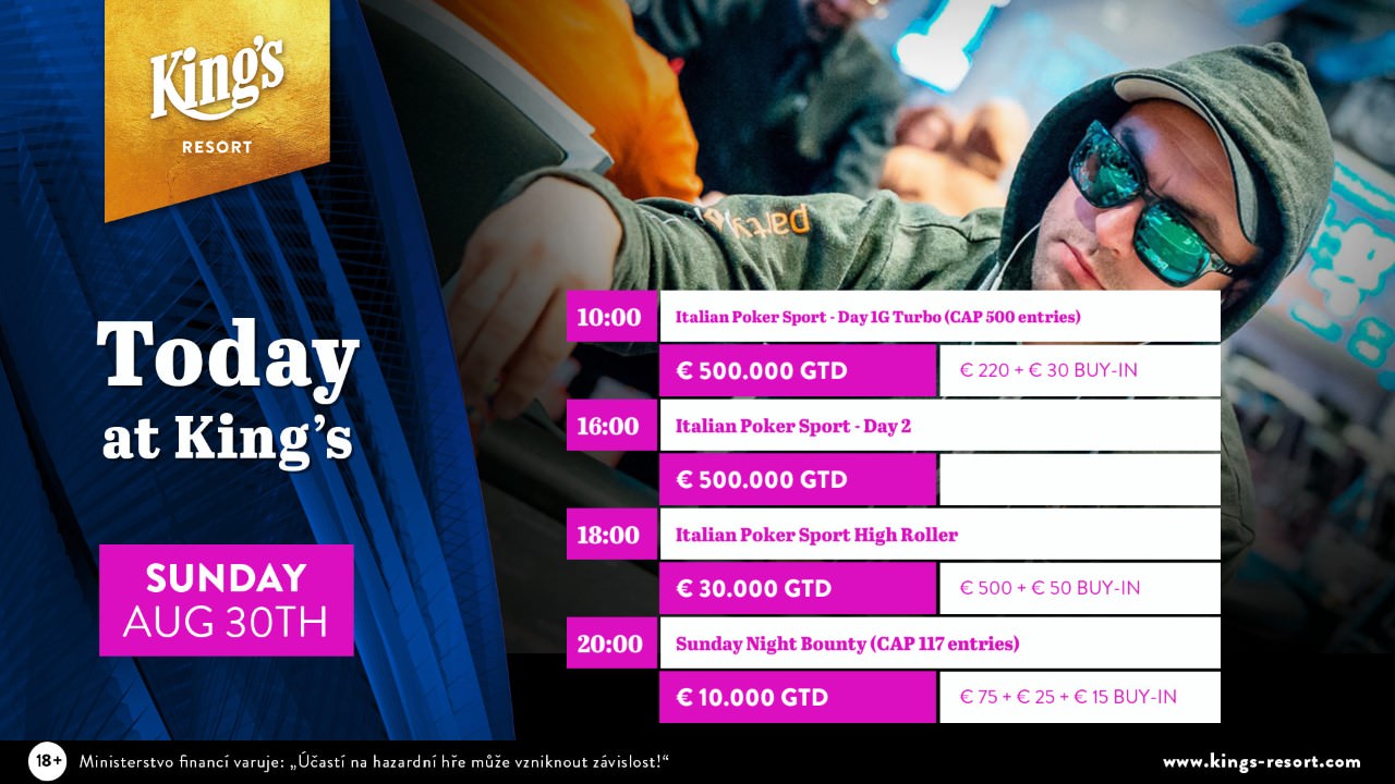 Heute stehen im King’s mehrere Turniere an. Neben Tag 1G und Tag 2 des Main Event gibt es auch noch das €550 IPS High Roller um 18 Uhr und das €115 Sunday Night Bounty um 20 Uhr im Angebot.