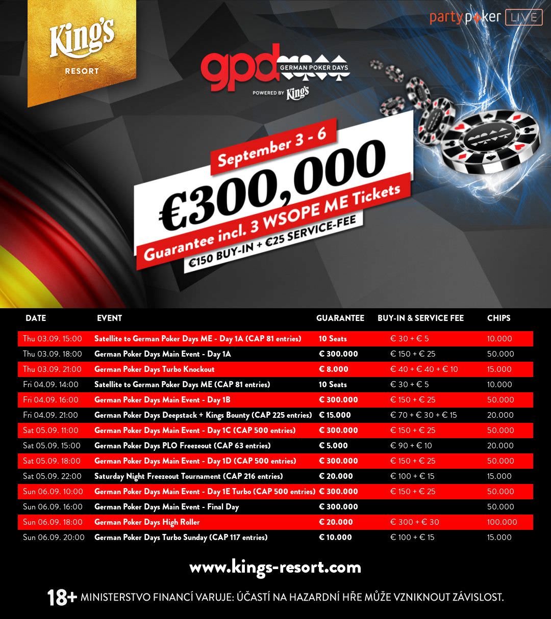 Am kommenden Donnerstag, den 3. September, beginnt im King’s Resort Rozvadov das beliebte German Poker Days (GPD) Festival, und die Spieler dürfen sich wieder auf einen erschwinglichen €175 Main Event mit einem gigantischen garantierten Preispool in Höhe von €300.000 freuen.