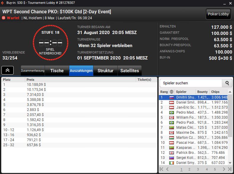 Beim $530 WPT Second Chance PKO haben 32 Spieler den ersten Tag überstanden Daniel Smiljkovic, Jan-Eric Schwippert und Pascal Hartmann sind hier auf den Plätzen zwei, drei und zehn zu finden. Die Konkurrenz ist allerdings riesig. In Führung liegt der Russe Dimitri Shutenko, zudem sind Pedro Madeira, William Foxen und Martin Czuczor in der Spitzengruppe vertreten.