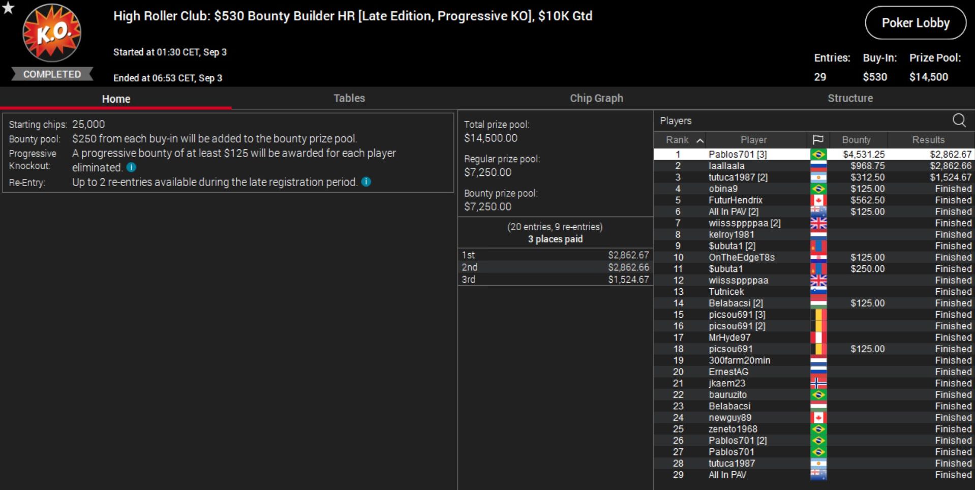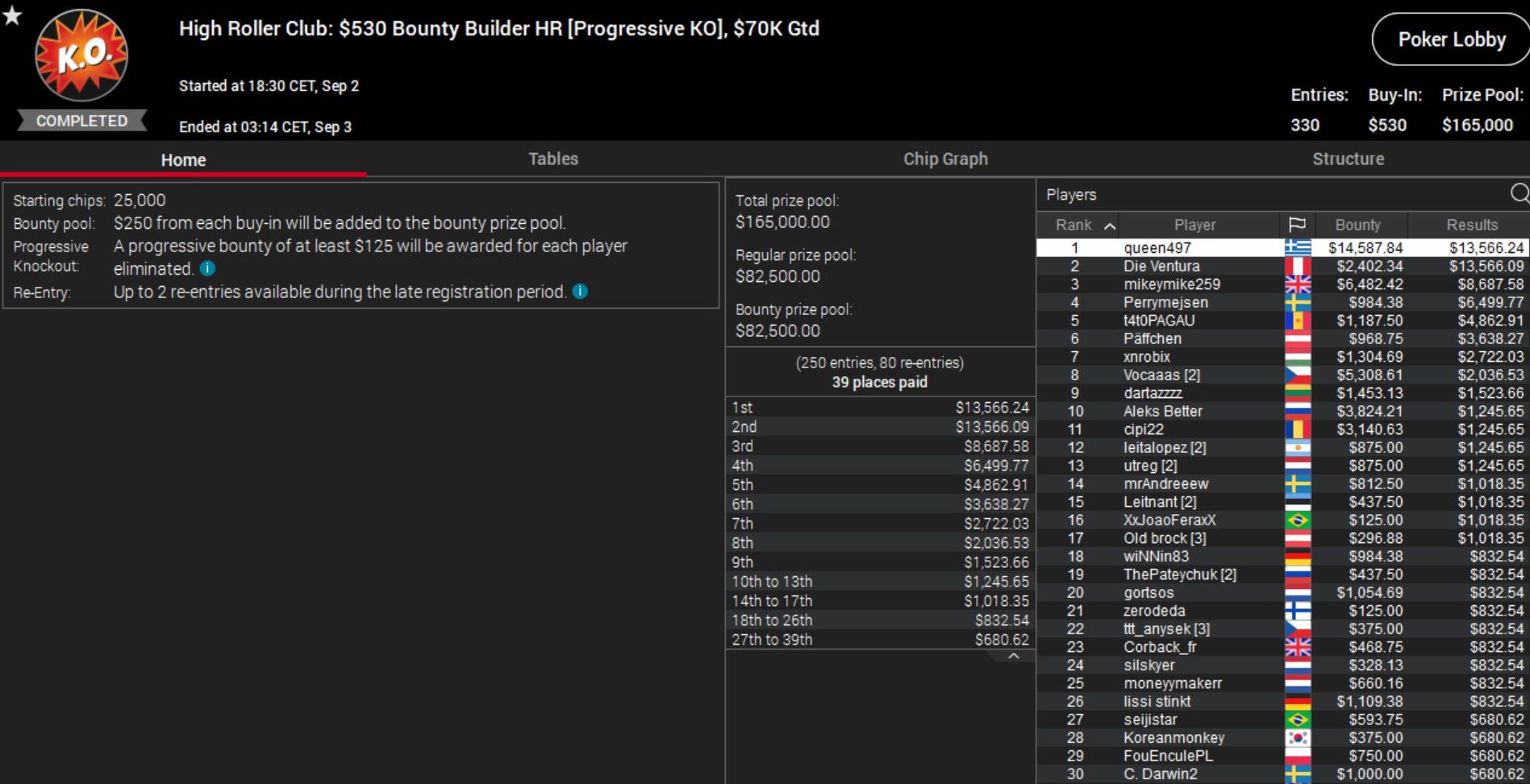 Größter Gewinner des Tages war der Grieche „queen497“, der für seinen Sieg beim Bounty Builder gut $28.000 abräumte.
