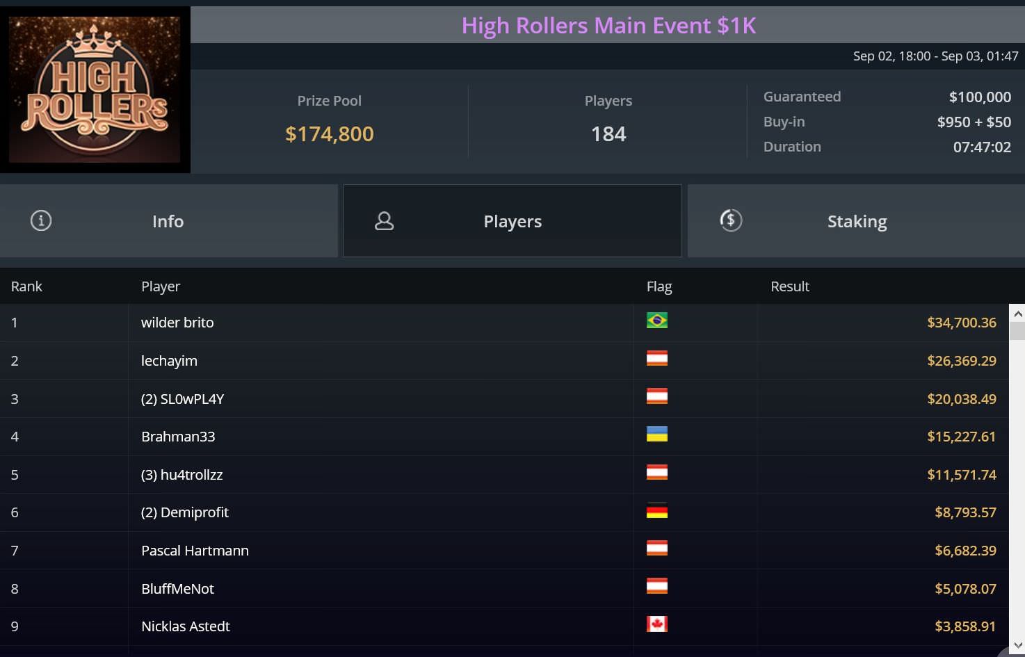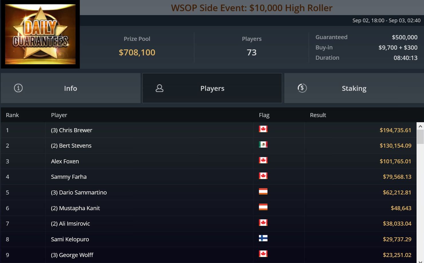 Größter Gewinner war Chris Brewer, der das 10k High Roller für sich entschied.