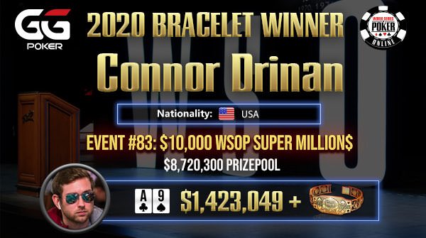 Der US-Amerikaner Connor Drinan hat beim $10K WSOP Super MILLION$ das letzte Bracelet der diesjährigen GGPoker World Series of Poker Online gewonnen. Für den 31-Jährigen, der sowohl live als auch online bereits Turnierpreisgelder im achtstelligen Bereich eingespielt hat, ist es der erste WSOP-Titelgewinn und der ging bei $1.423.049 Prämie mit einem gewaltigen Zahltag einher.