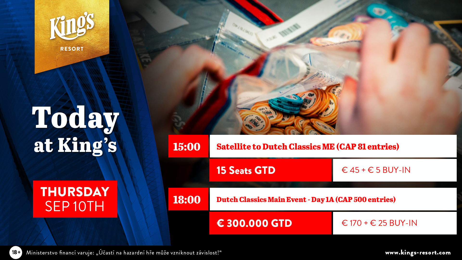 Im King’s Resort geht es am Donnerstag um 15:00 Uhr mit dem €45+€5 Satellite für den Tag 1a des €195 Dutch Classics Main Event los. 15 Tickets sind garantiert und es gibt ein CAP von 81 Entries.