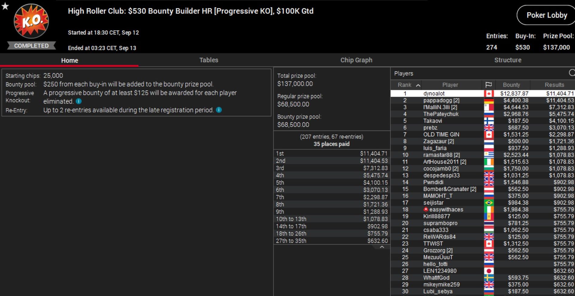 Haarscharf am Sieg vorbei schrammte derweil „pappadogg“ aus Deutschland beim $530 Bounty Builder.