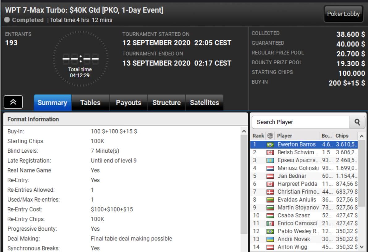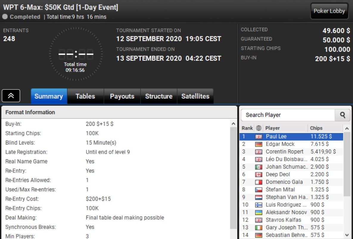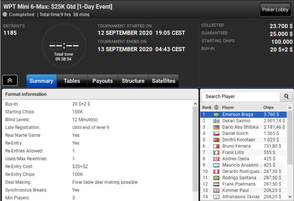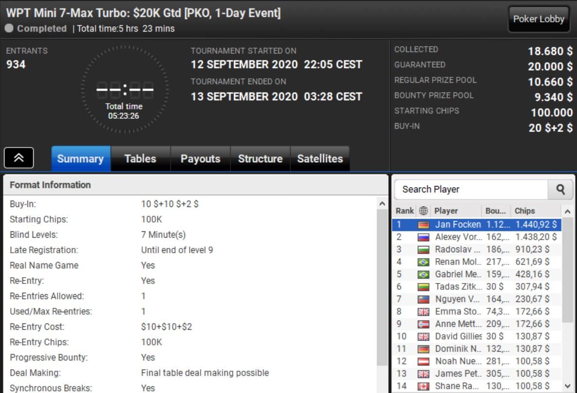 Den Sieg beim WPT Mini 7-Max holte sich Jan Focken. Der Deutsche ließ alle 933 Konkurrenten hinter sich und kassierte mit einem Startgeld von $22 über $2.500 Preisgeld.