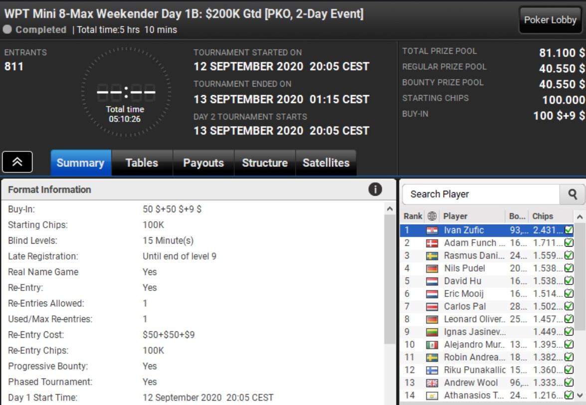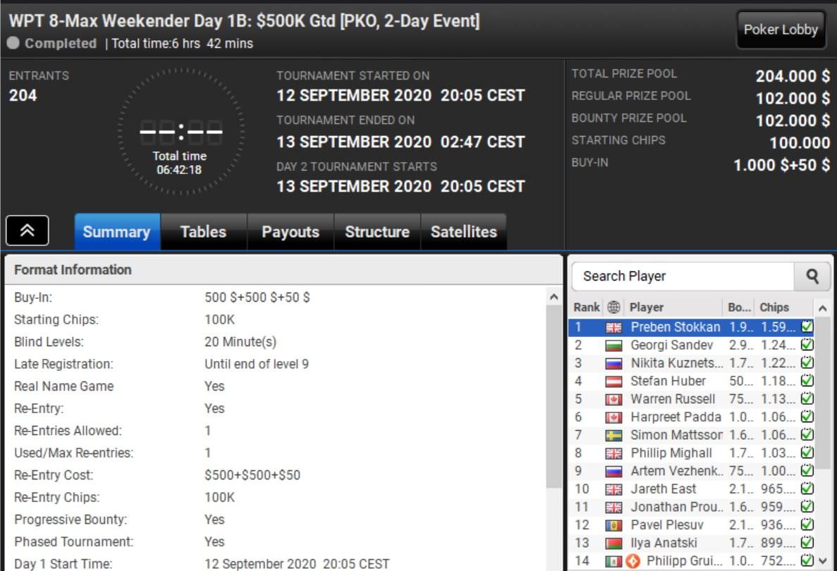 Gespielt wurde zudem in allen drei Kategorien Tag 1B des WPT Weekender. In der $1.050 teuren, großen Variante konnte sich Stefan Huber mit Platz 4 eine glänzende Ausgangsposition erarbeiten.