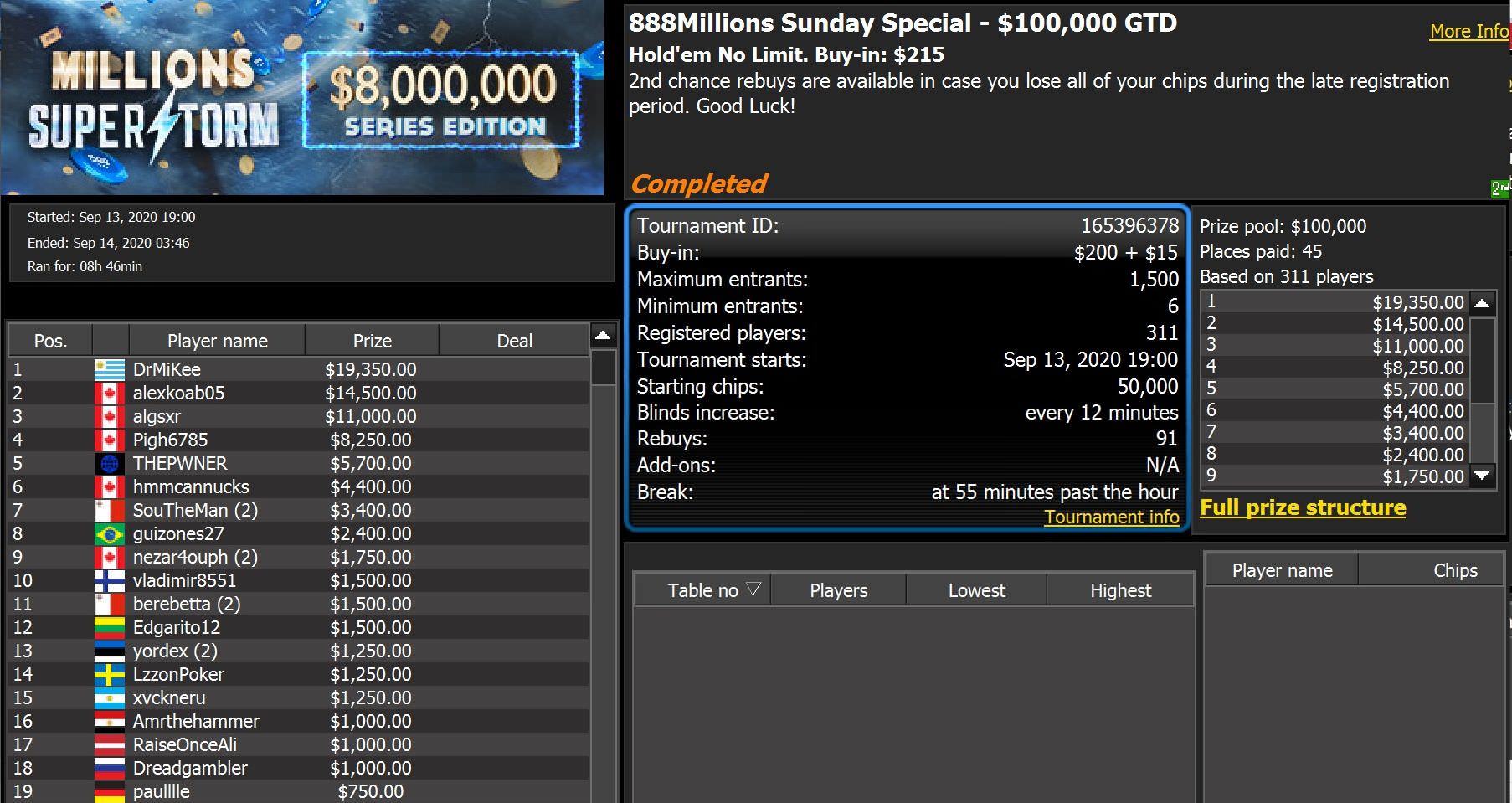 Beim $100.000 Sunday Special wurden 402 Entrys á $215 getätigt, womit 888poker rund $20.000 obendrauf legte.