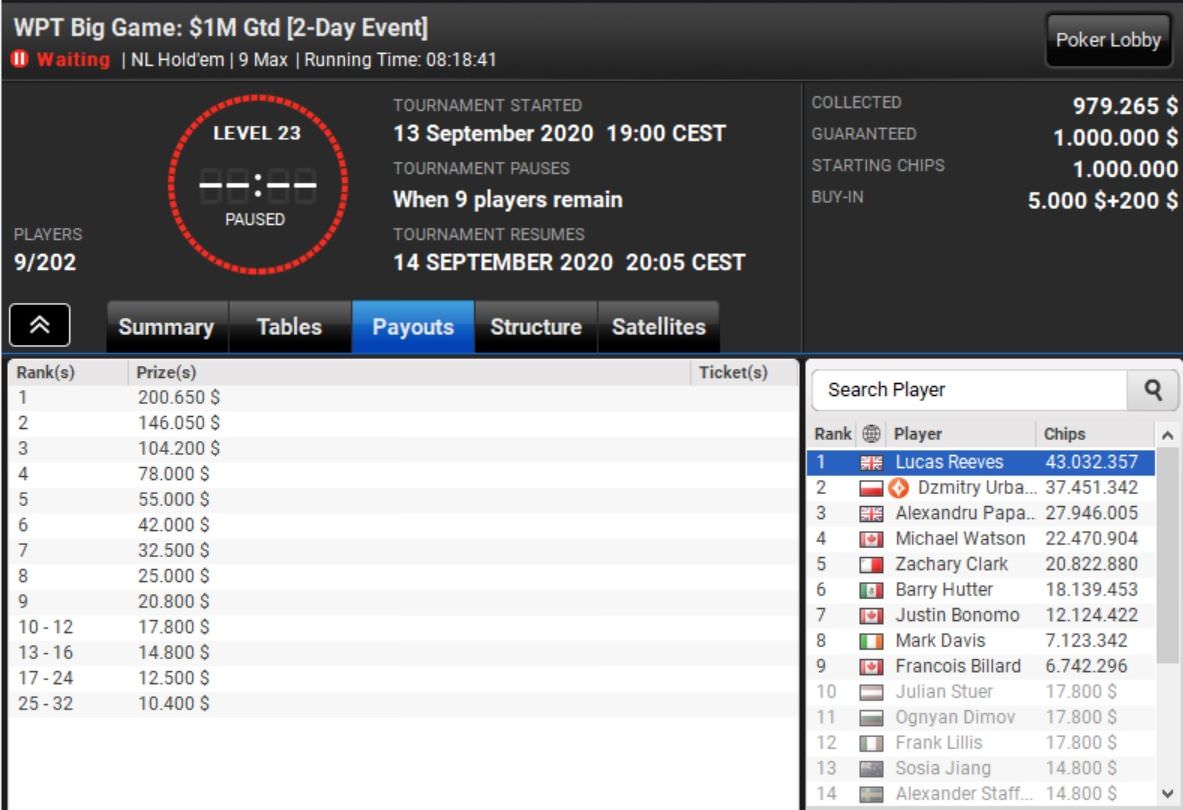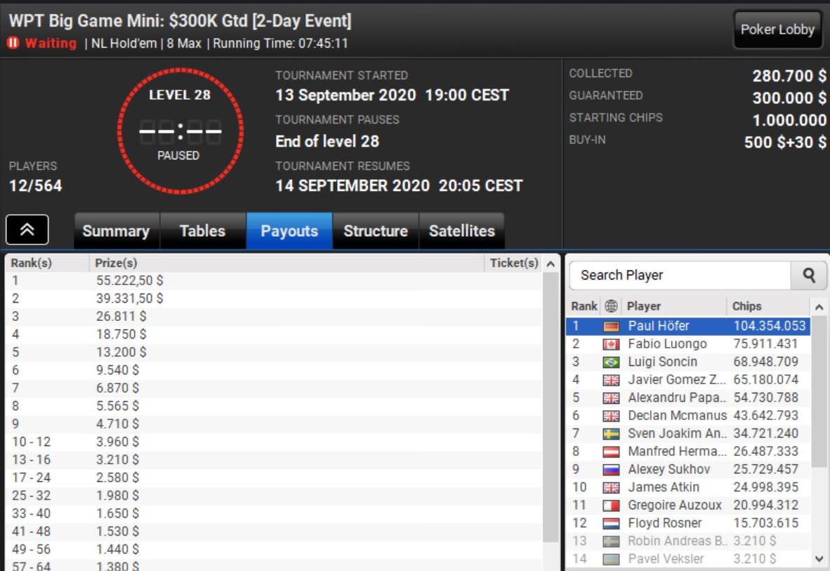 Auch vom Big Game gibt es Positives zu vermelden. Zwar schied Julian Stuer bei der großen Variante als letzter Spieler vor dem heutigen Finale auf Platz 10 aus und musste sich mit $17.800 trösten, doch dafür führt Paul Höfer das Finale in der kleinen Variante an.