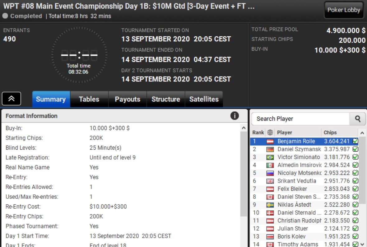 Allen voran Benjamin Rolle zeigte wieder einmal, was in ihm steckt. An Tag 1B des $10.300 WPT Main Event Championship ließ der deutsche Highroller sämtliche 489 Konkurrenten hinter sich und reihte sich hinter Blaz Zerjav auf Platz 2 im Gesamt-Leaderboard ein.