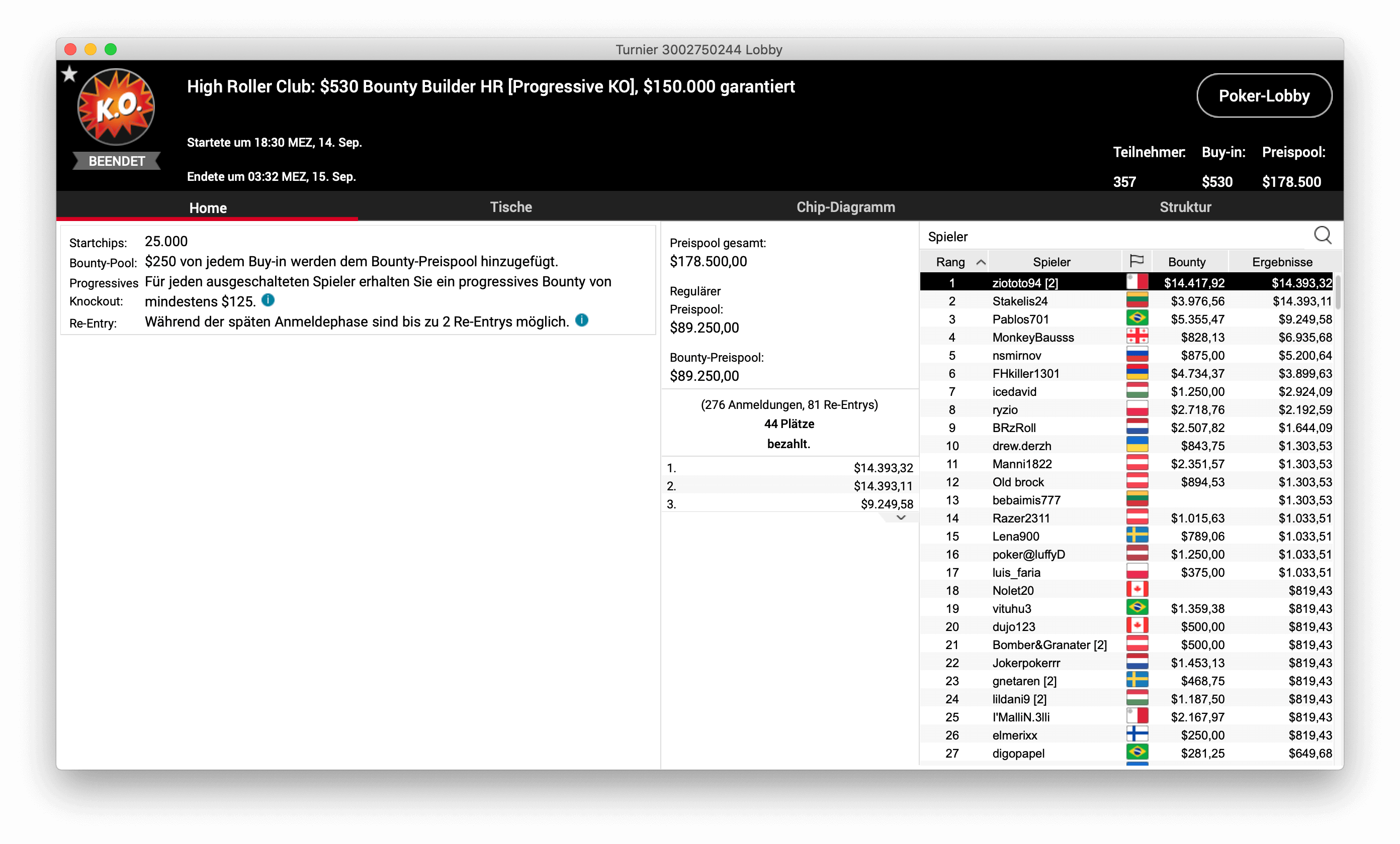 Das $530 Bounty Builder HR ludt 276 Spieler ein, die sich für insgesamt 357 Entries entschieden. Der Preispool lag bei $178.500 und den Sieg holte sich „ziototo94“ mit seiner zweiten Bullet für knapp $28k.