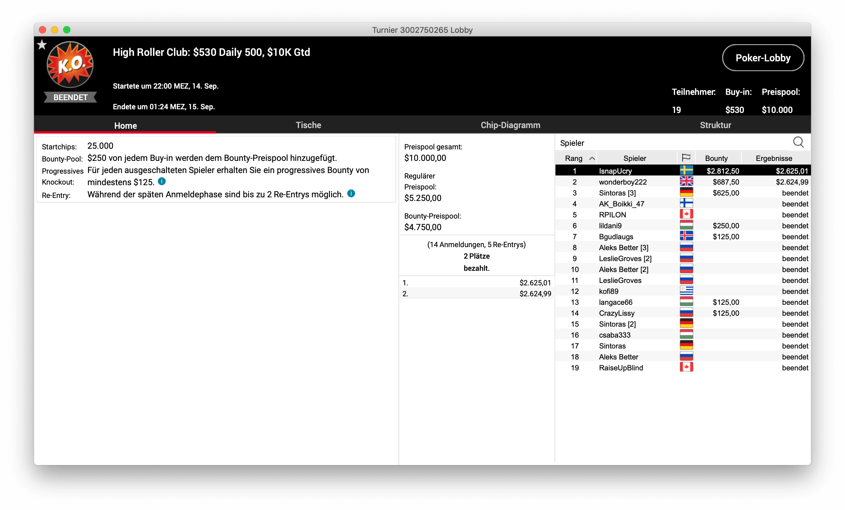 Die 19 Entries im Daily 500 sorgten nicht für das Knacken der Garantie, womit der Preispool bei $10.000 lag. Regular „IsnapUcry“ schnappte sich den Sieg und mehr als $5k.