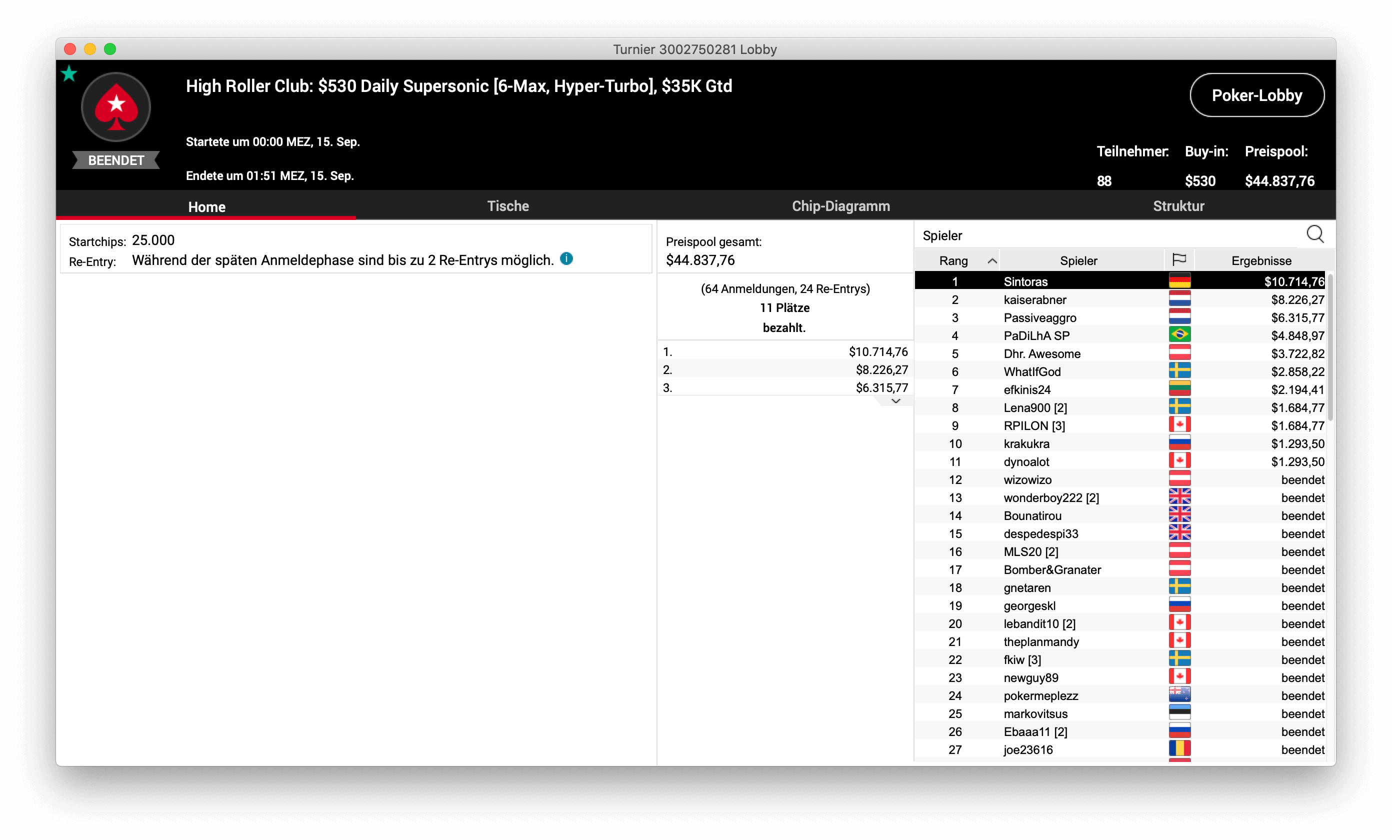 Der unbekannte Online-Regular gewann das Daily Supersonic mit $530 Buy-In, das bei 88 Entries einen Preispool in Höhe von knapp $45.000 verbuchen konnte. „Sintoras“ gewann das Turnier und durfte sich über $10.714 freuen.