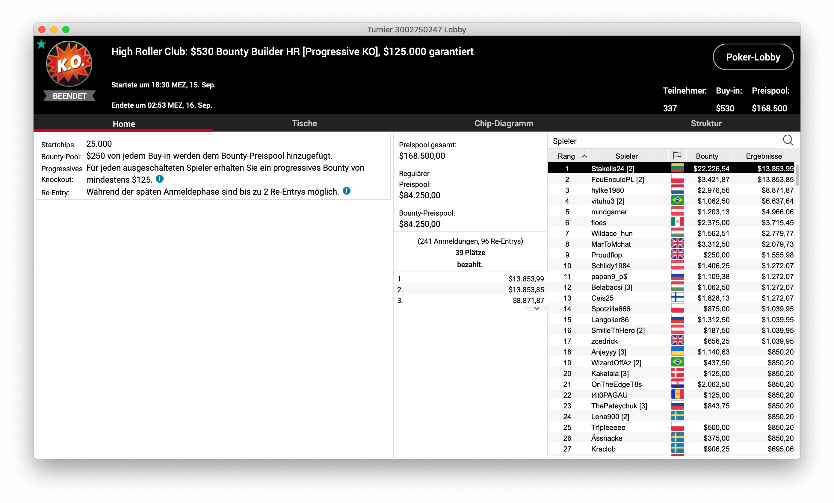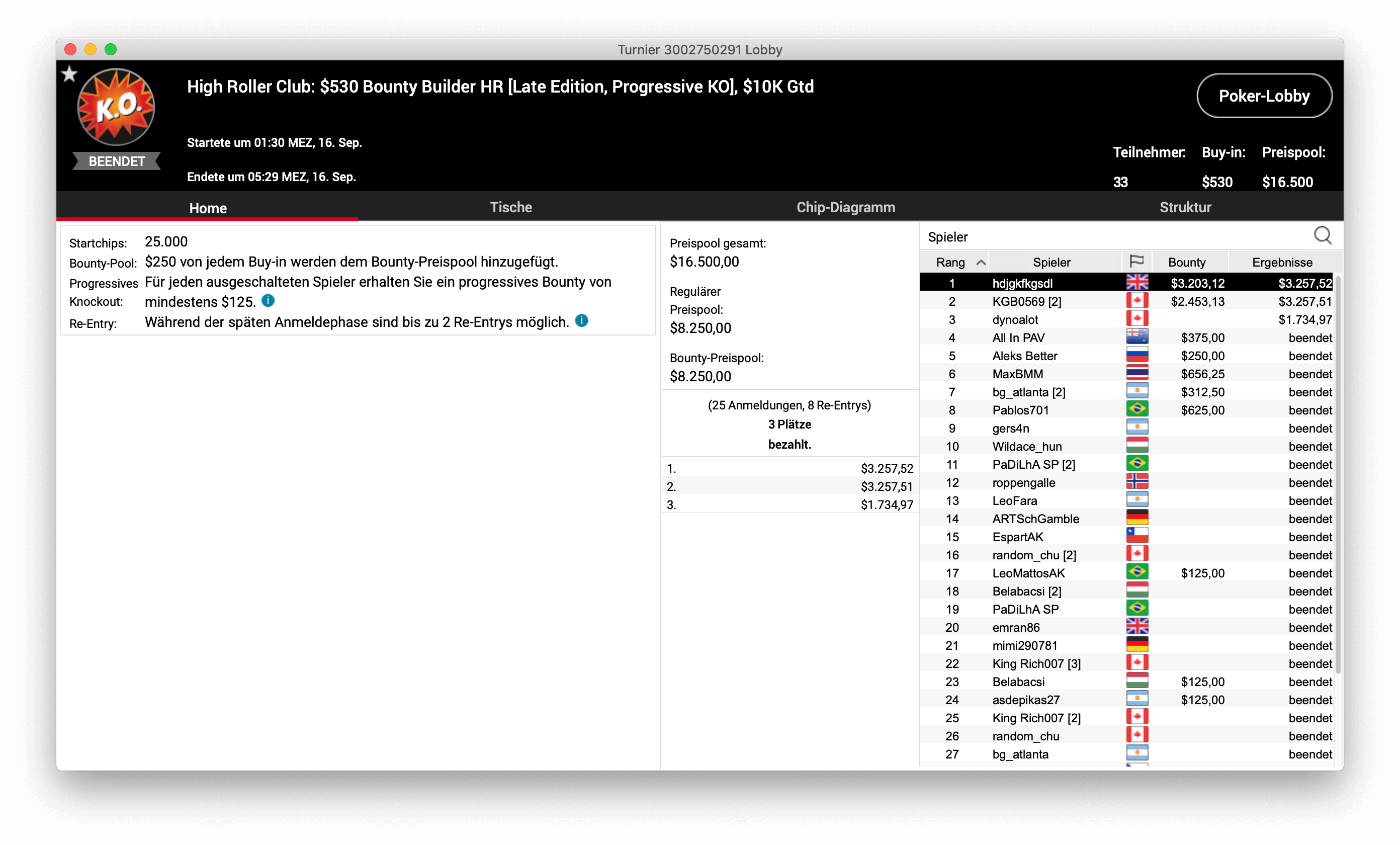 Aus Großbrittanien gewann Fabio Sperling mit dem unleserlichen Nick „hdkgkfkgsdl“ das Bounty Builder HR in der Late Edition mit einem $16.500 Preispool. Er durfte sich über knapp $6,5k freuen. Runner-Up wurde der Regular „KGB0569“ vor Alex „dynalot”“ Difelice auf Platz 3.