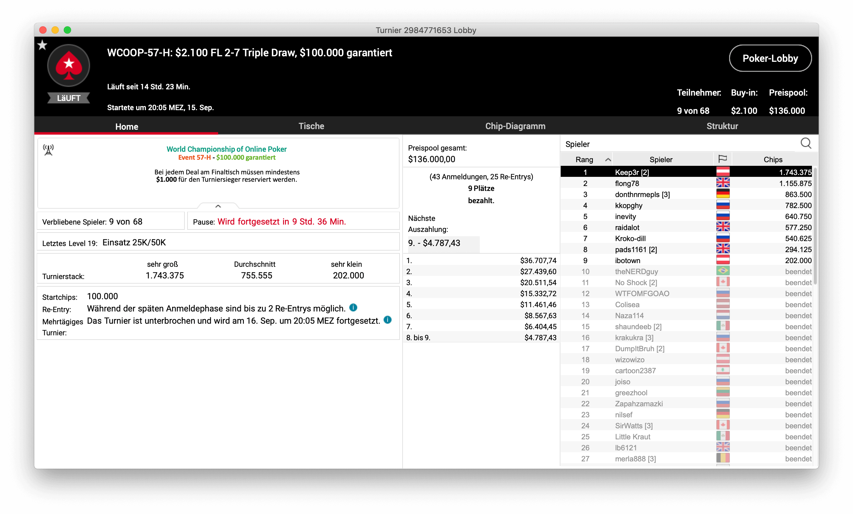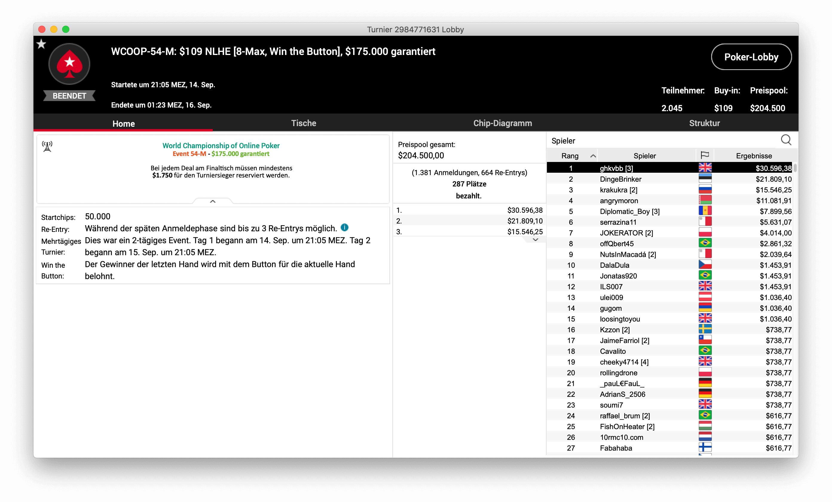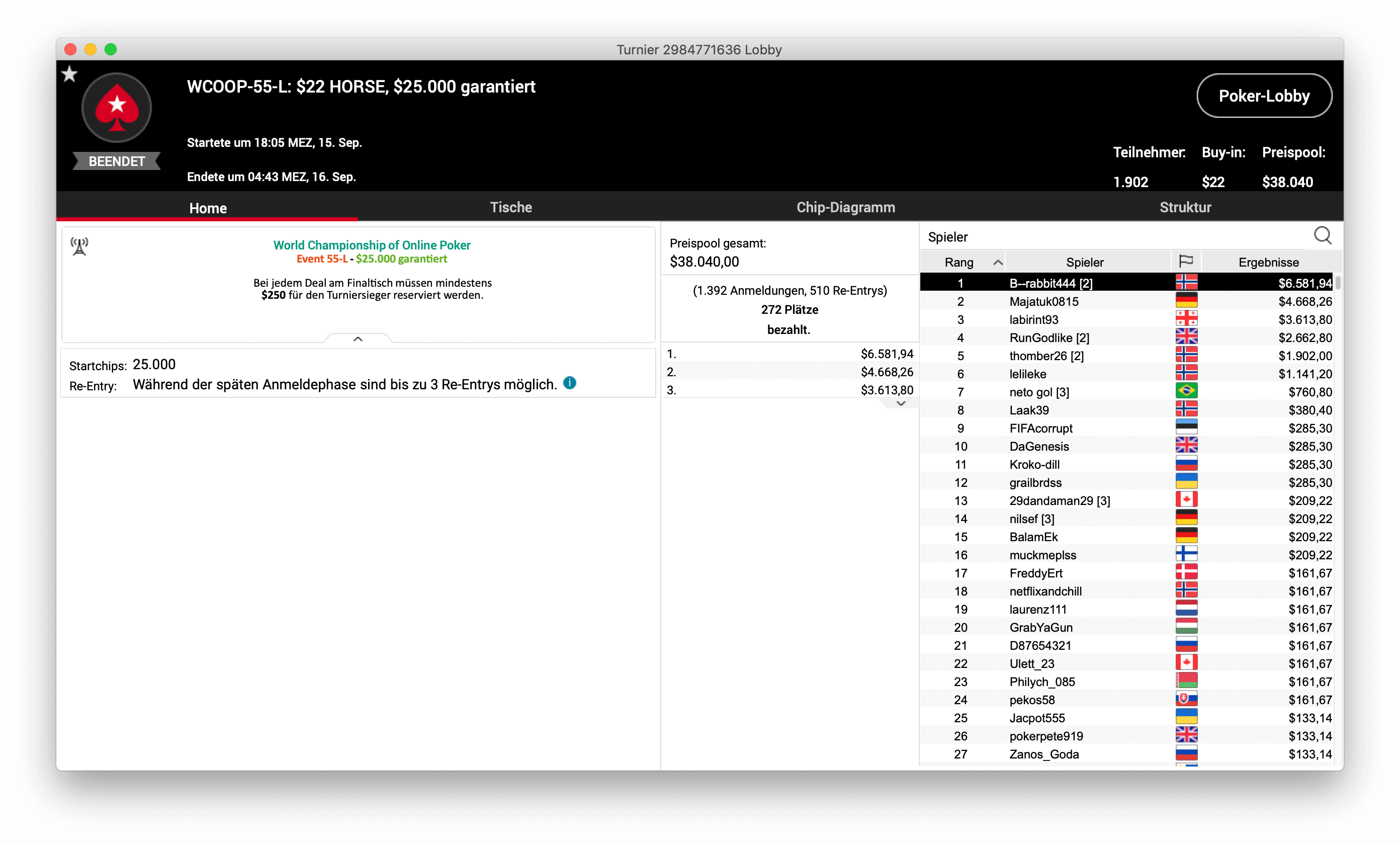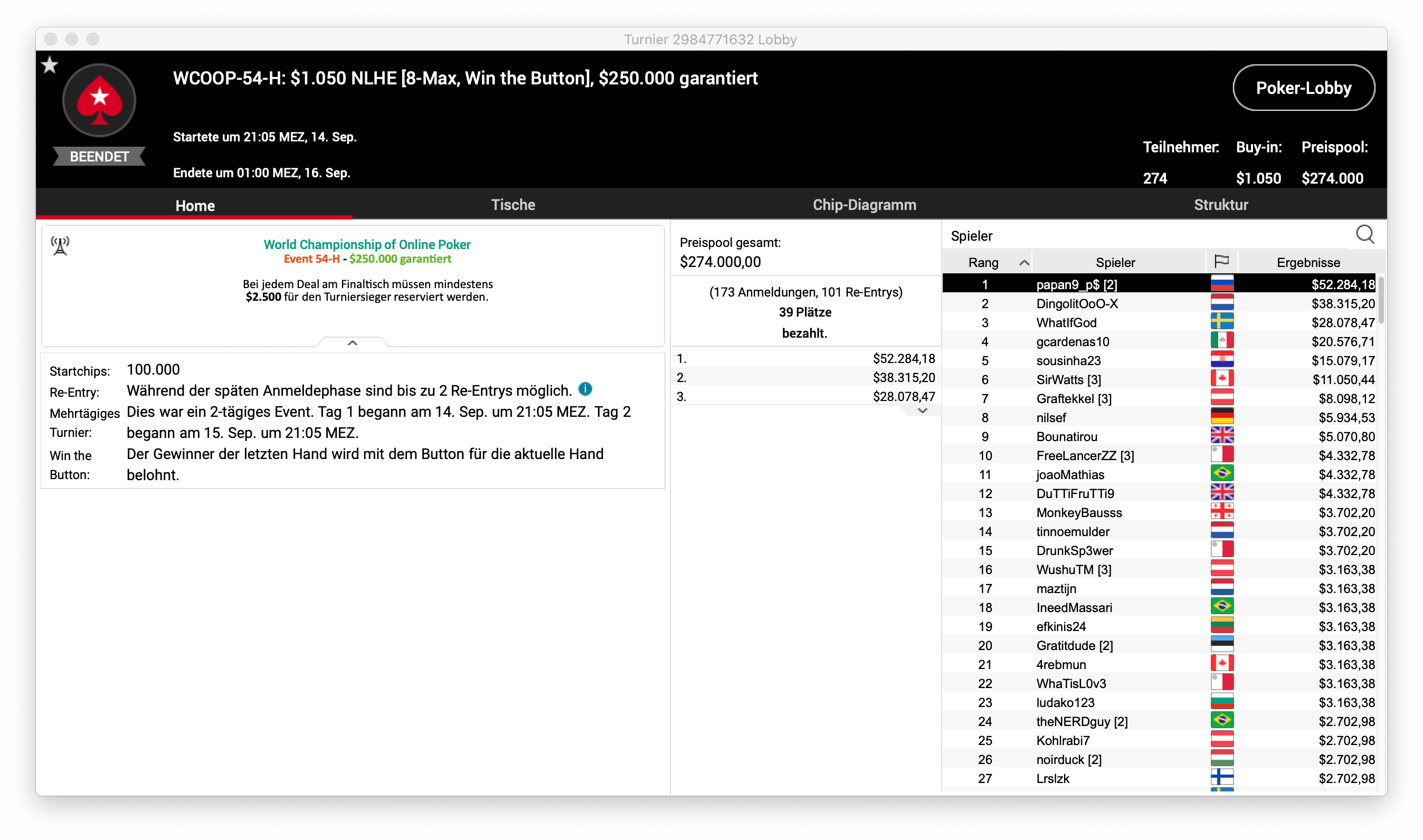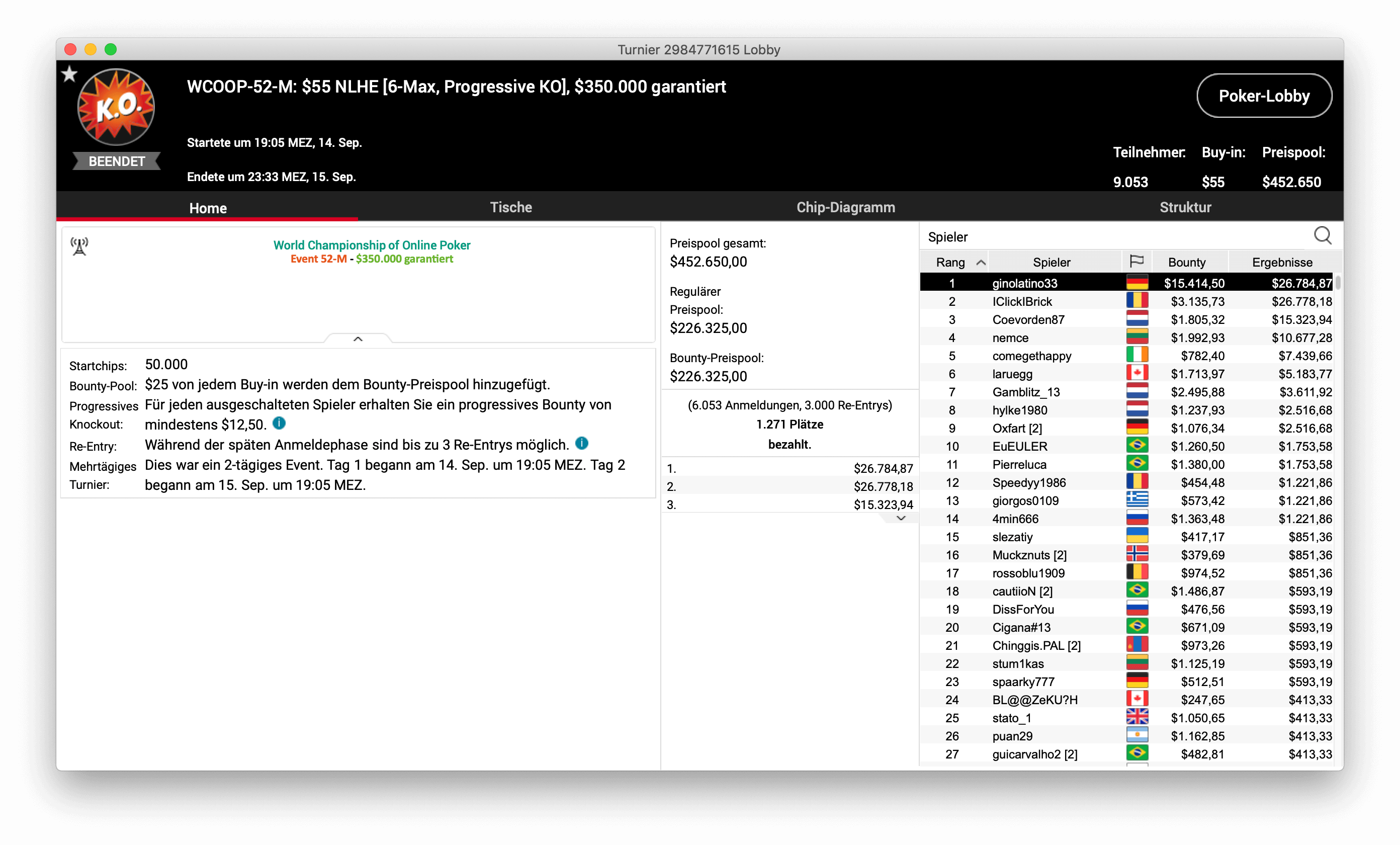 Für einen deutschen Sieg sorgte dann unter anderem „ginolatino33“ beim WCOOP-52-M mit $55 Buy-In. 9.053 Entries duellierten sich hier um einen $452.650 Preispool. „ginolatino33“ bekam das größte Stück vom Kuchen und cashte für $42k.