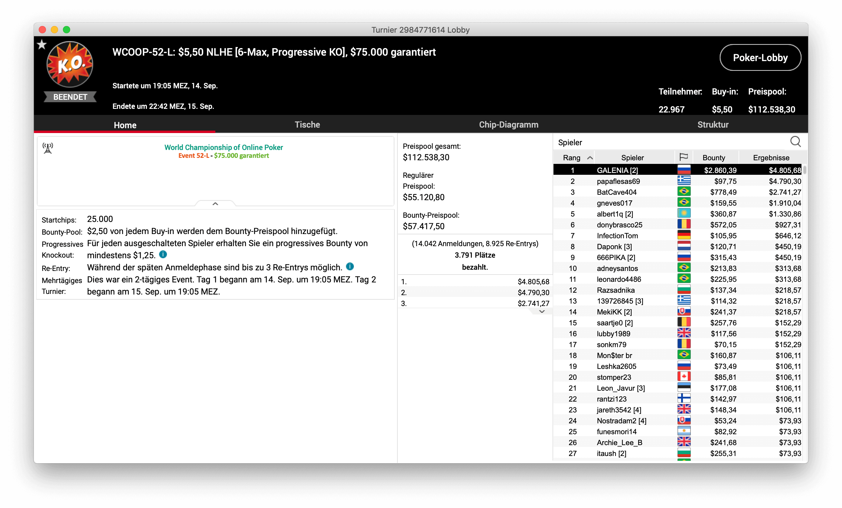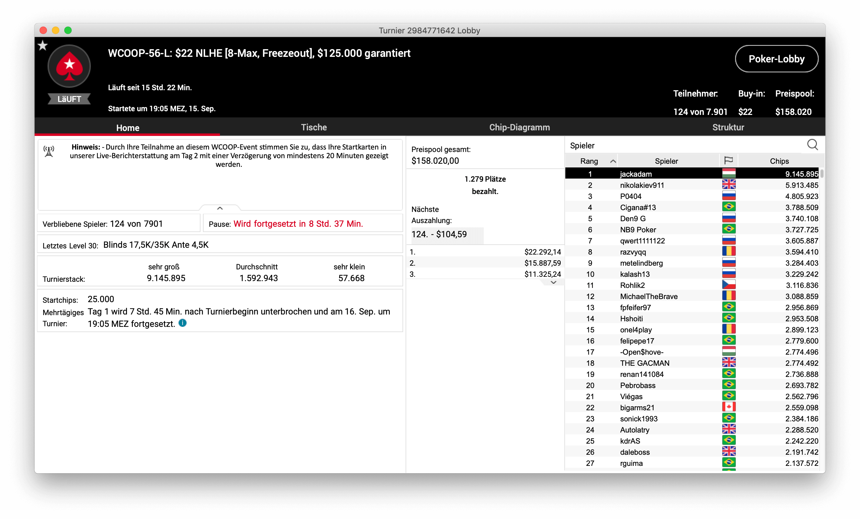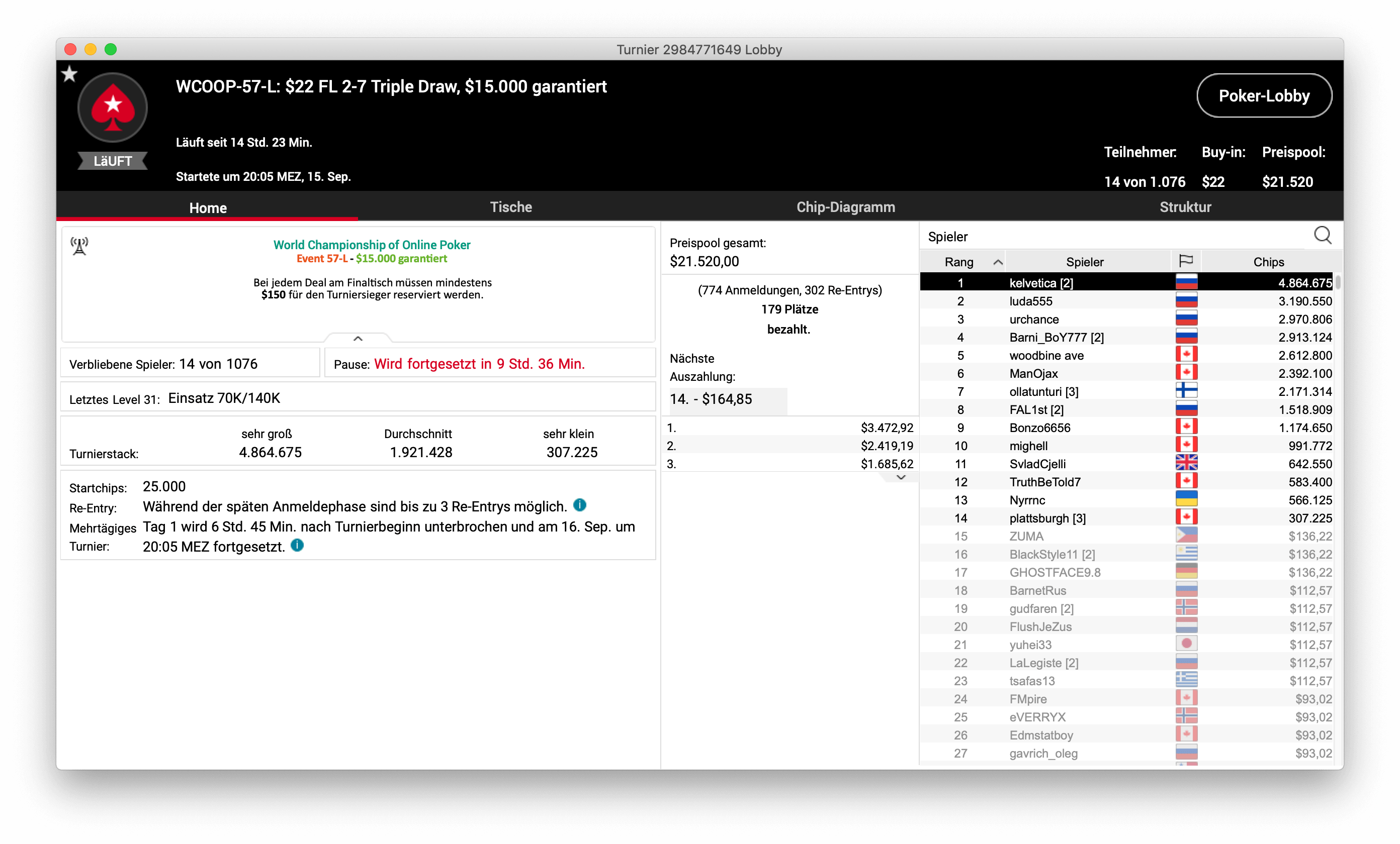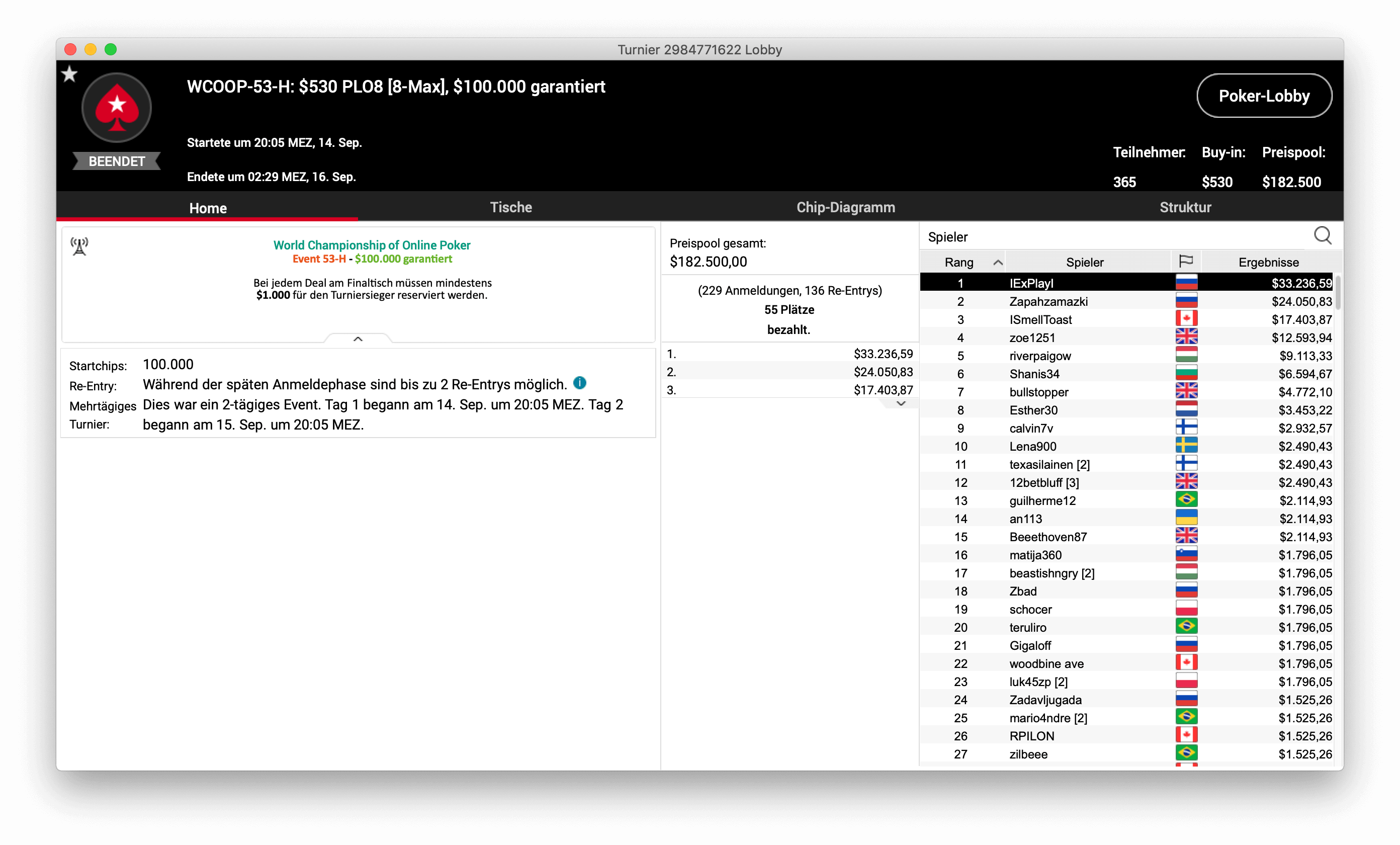 Für einen deutschen Sieg sorgte dann unter anderem „ginolatino33“ beim WCOOP-52-M mit $55 Buy-In. 9.053 Entries duellierten sich hier um einen $452.650 Preispool. „ginolatino33“ bekam das größte Stück vom Kuchen und cashte für $42k.