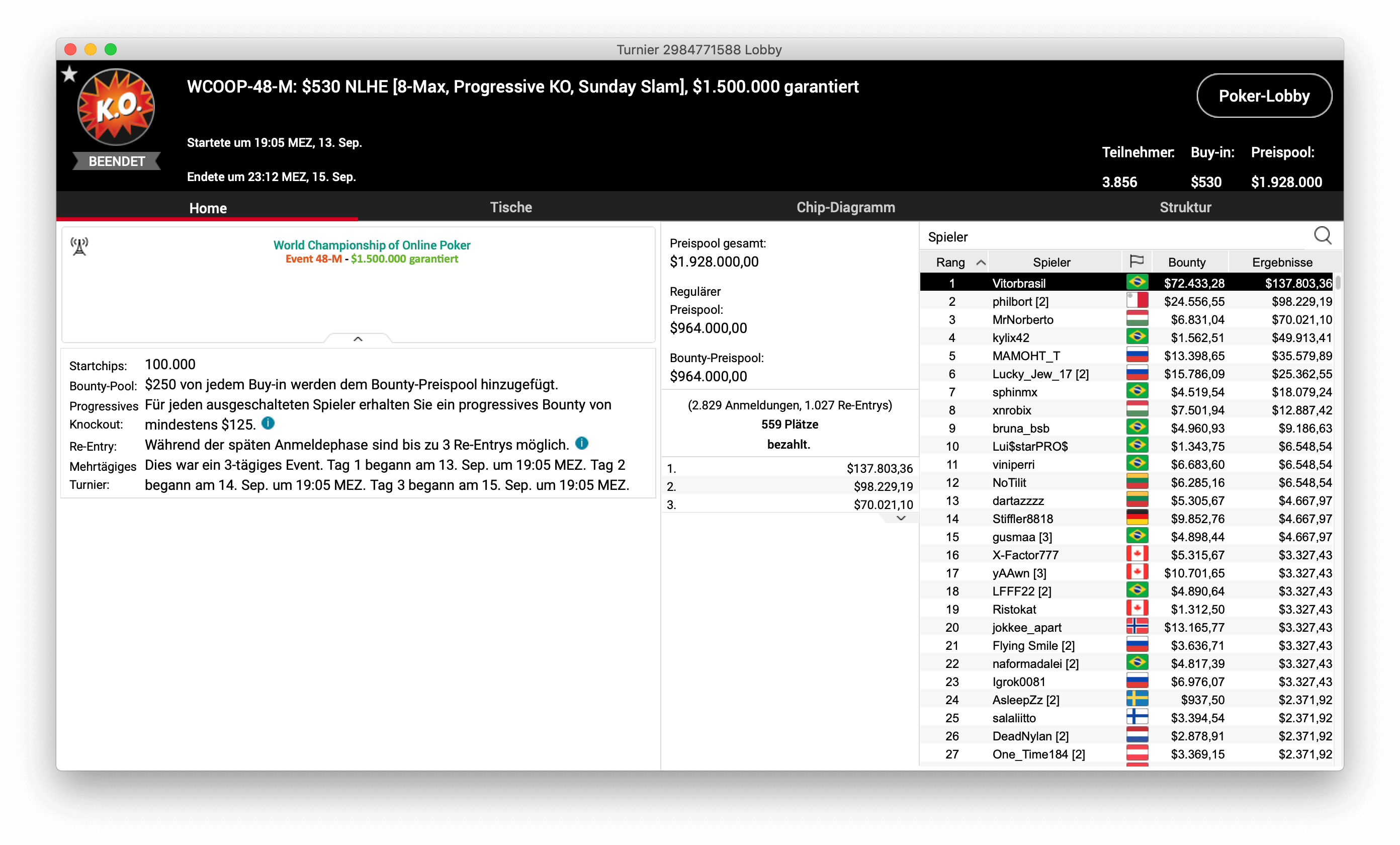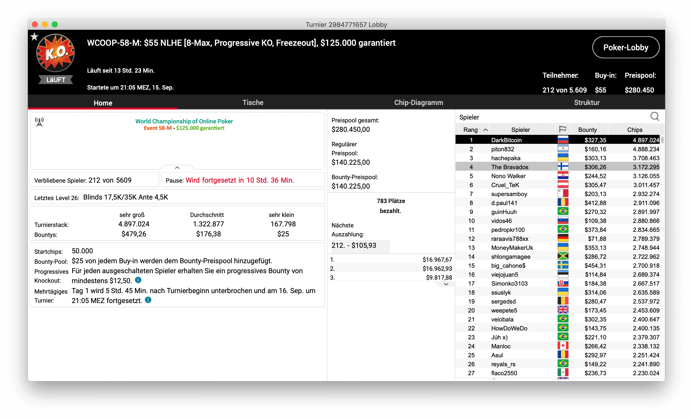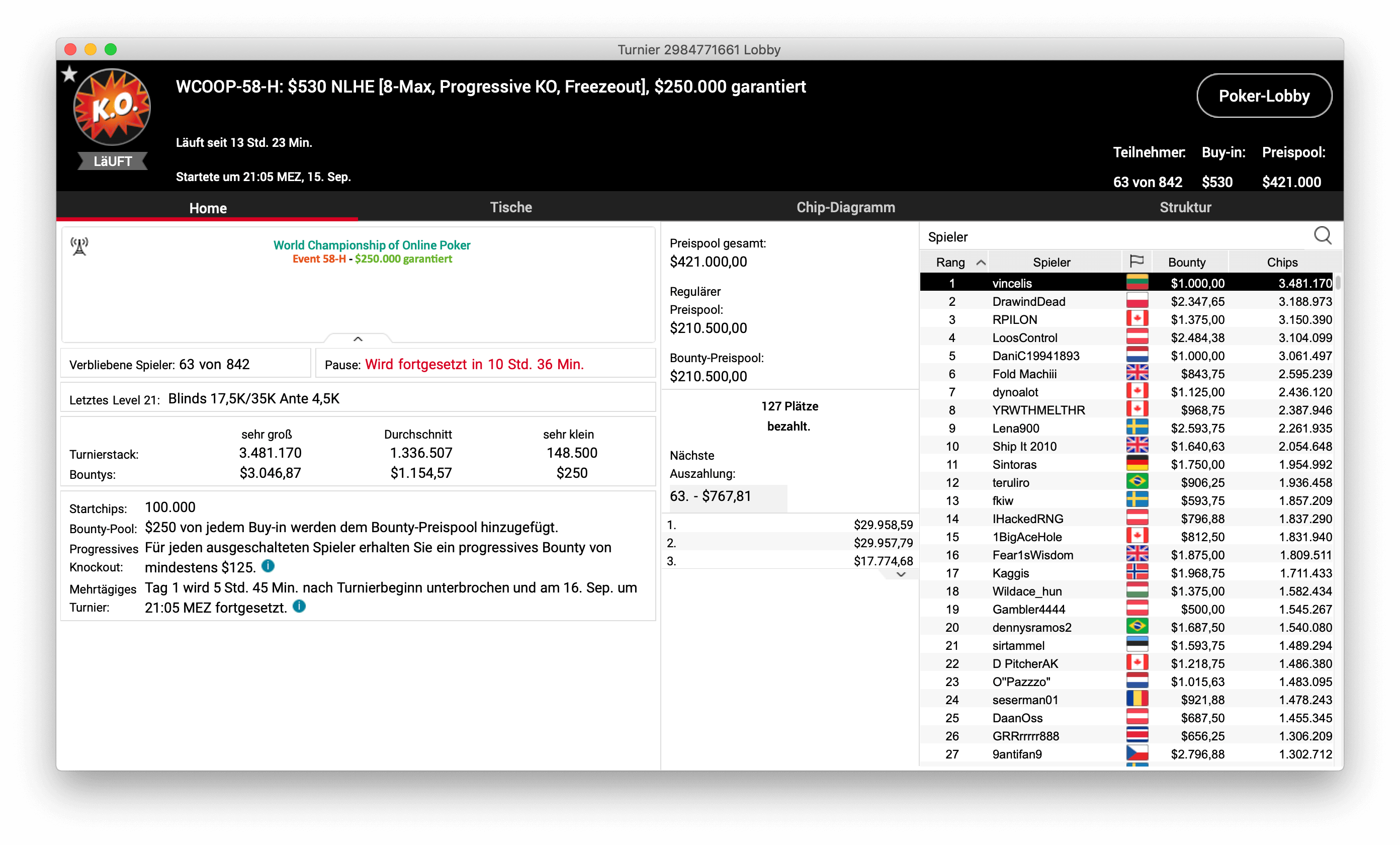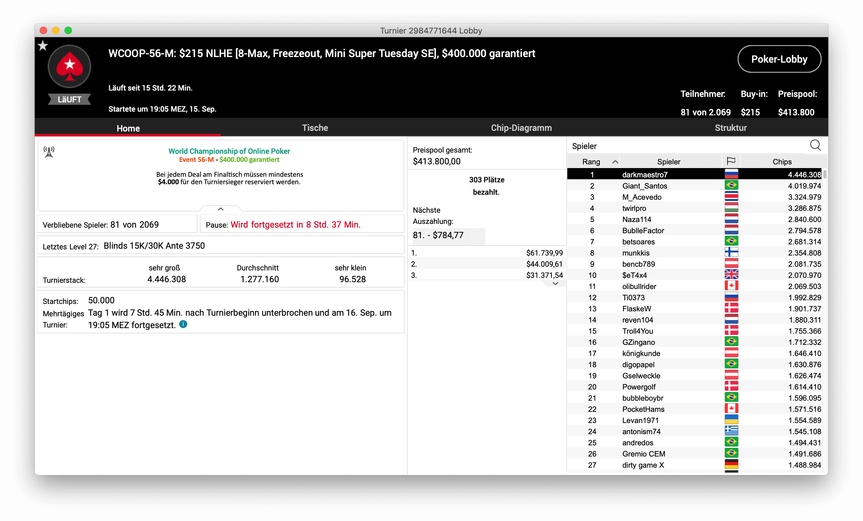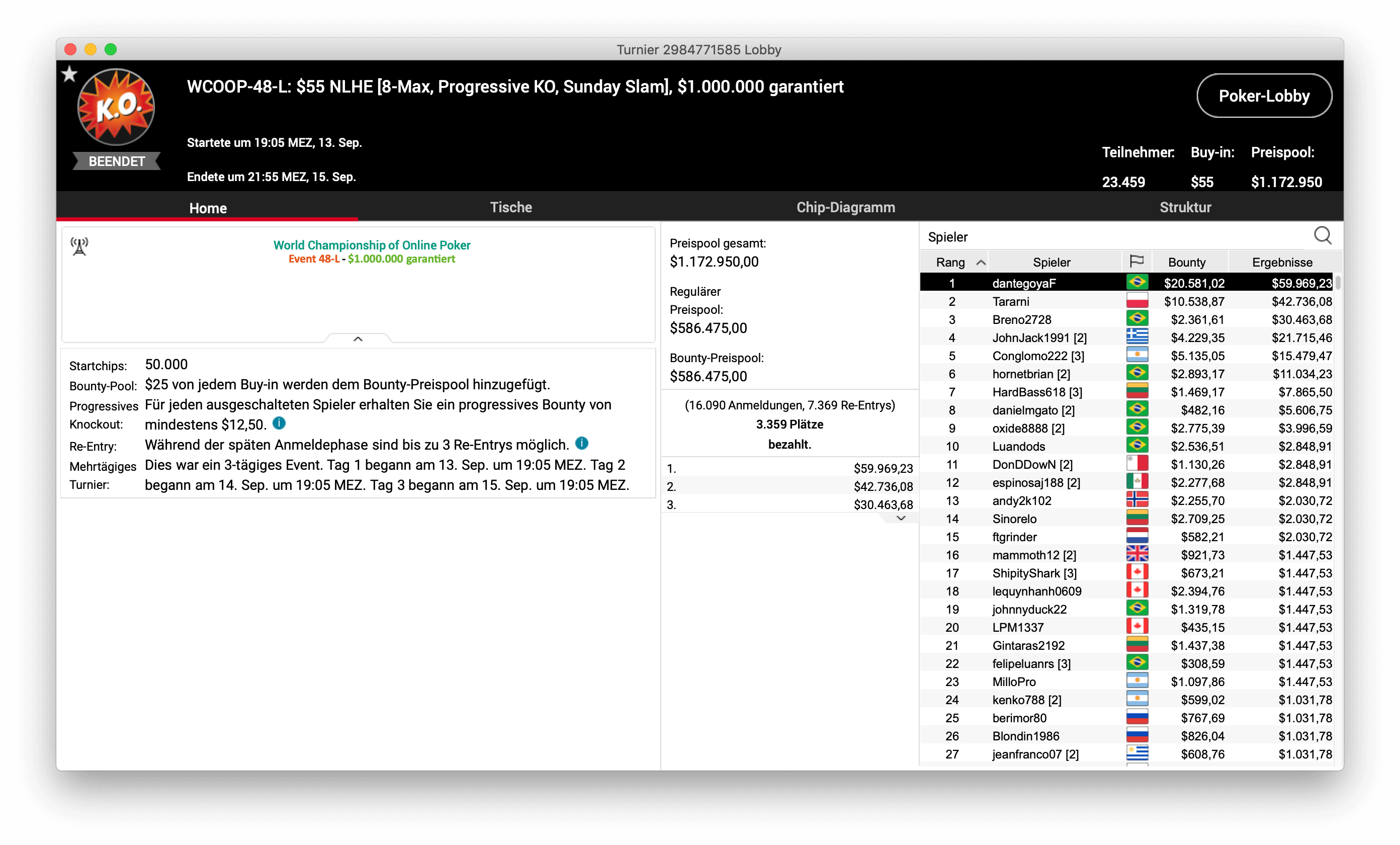 Für einen deutschen Sieg sorgte dann unter anderem „ginolatino33“ beim WCOOP-52-M mit $55 Buy-In. 9.053 Entries duellierten sich hier um einen $452.650 Preispool. „ginolatino33“ bekam das größte Stück vom Kuchen und cashte für $42k.