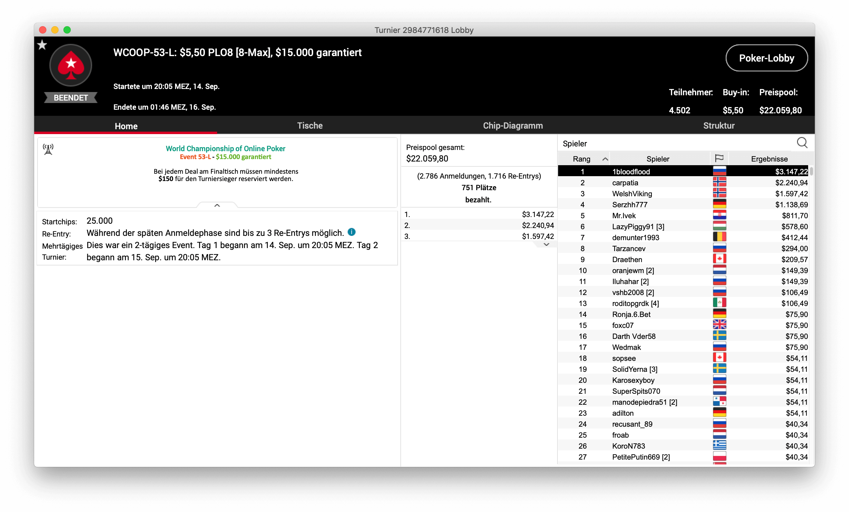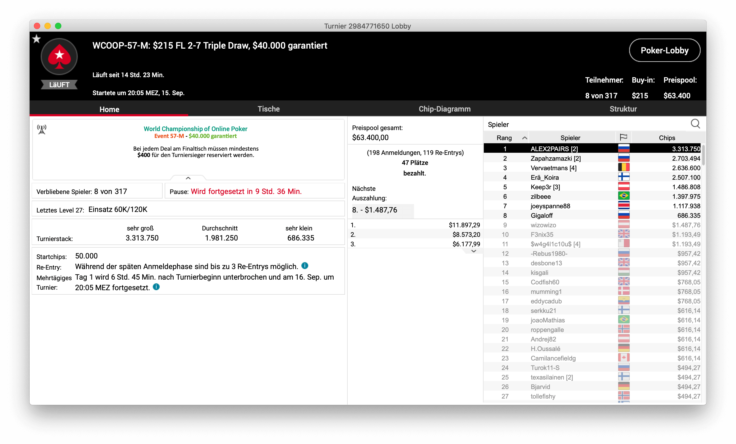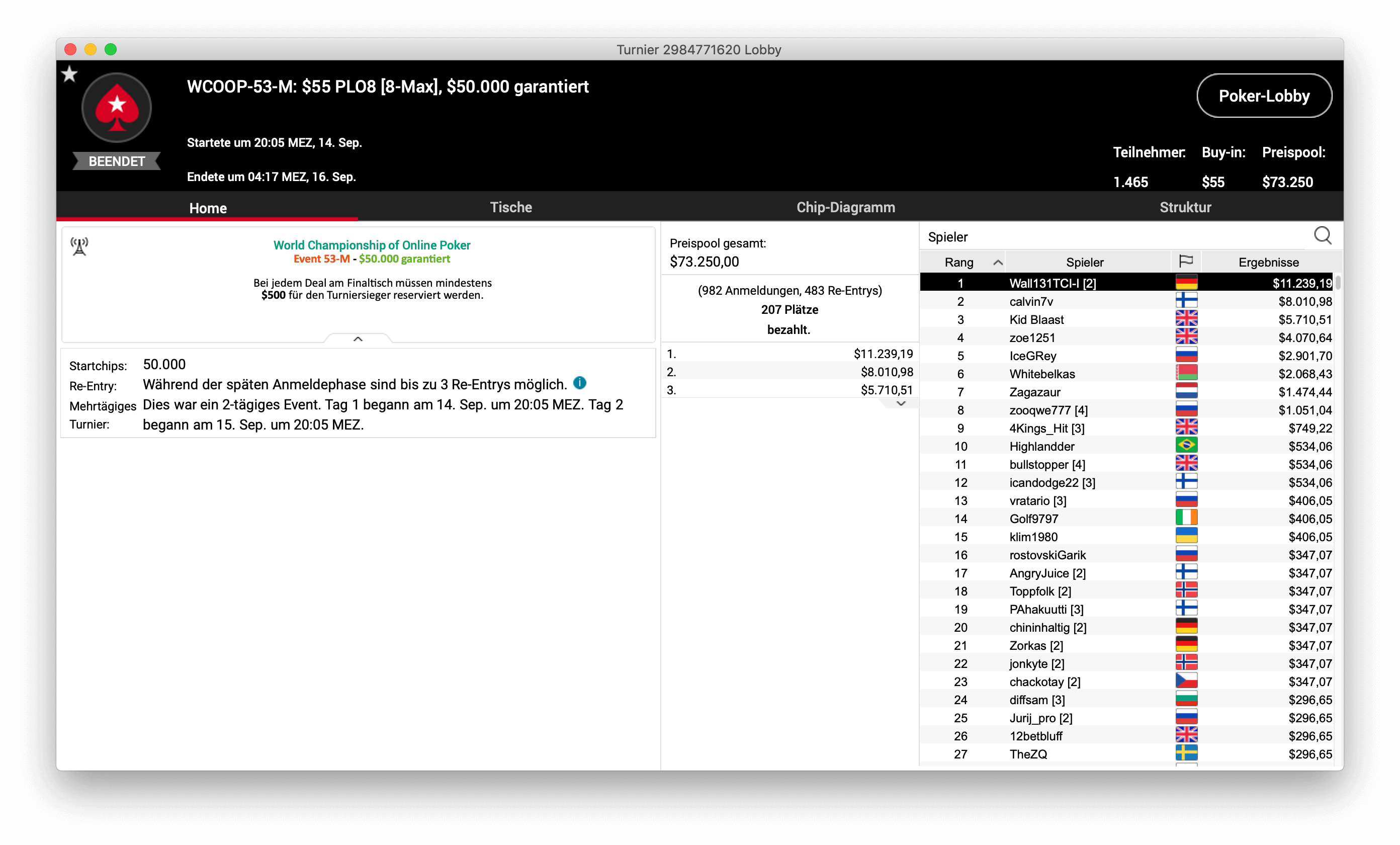 Noch ein deutscher Sieg konnte bei Event 53-M errungen werden. Beim PLO8 kamen 1.465 Entries für $55 zustande, der Preispool lag bei $73.250. „WALL131TCI-I“ gewann das Turnier für $11.239 vor dem Finnen „calvin7v“.