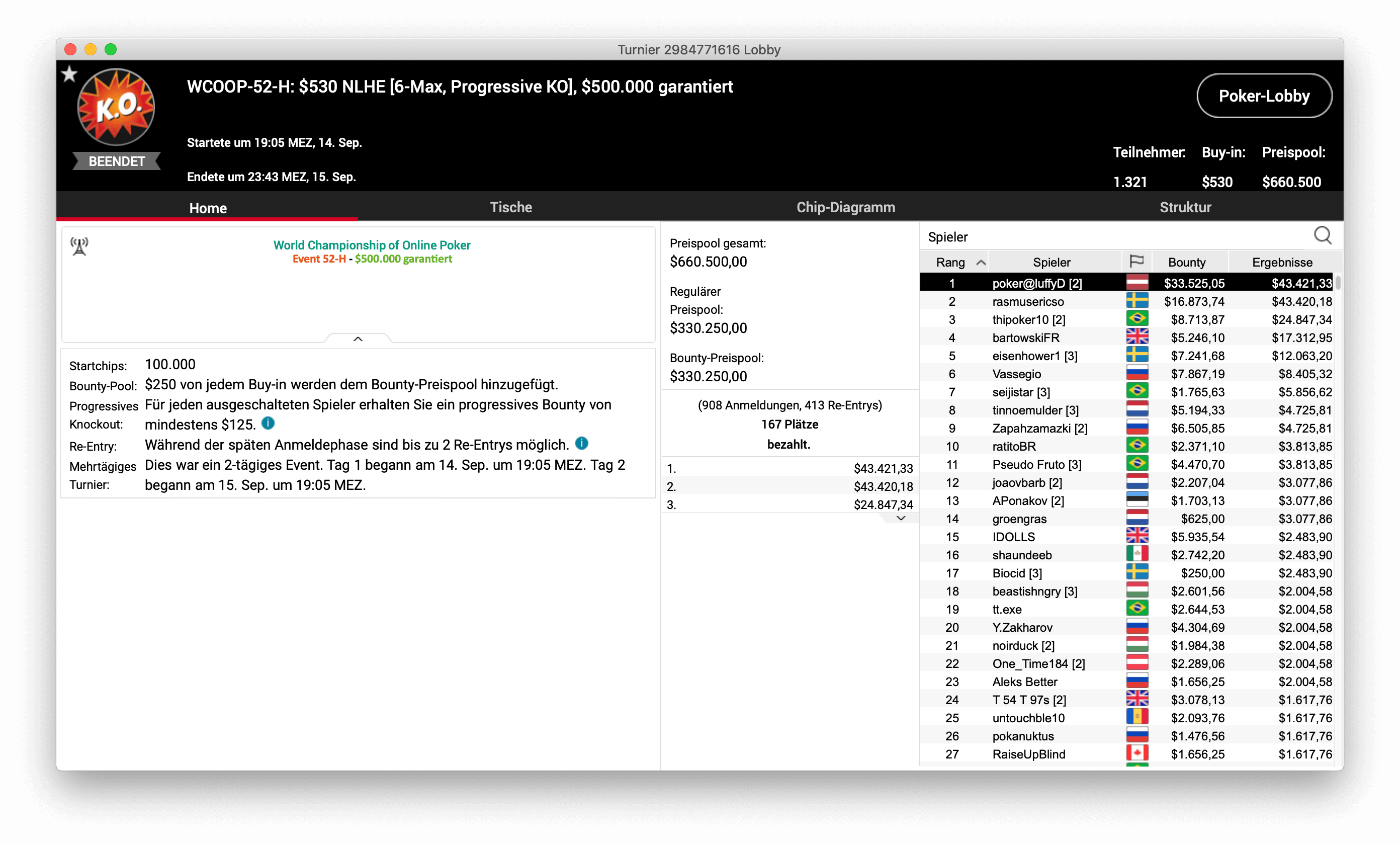 Guntis „poker@luffyD“ Aleskins hat sich den Sieg beim WCOOP Event 52-H gesichert. Er gewann knapp $76k bei einem $530 Buy-In gegen 1.320 Gegner.