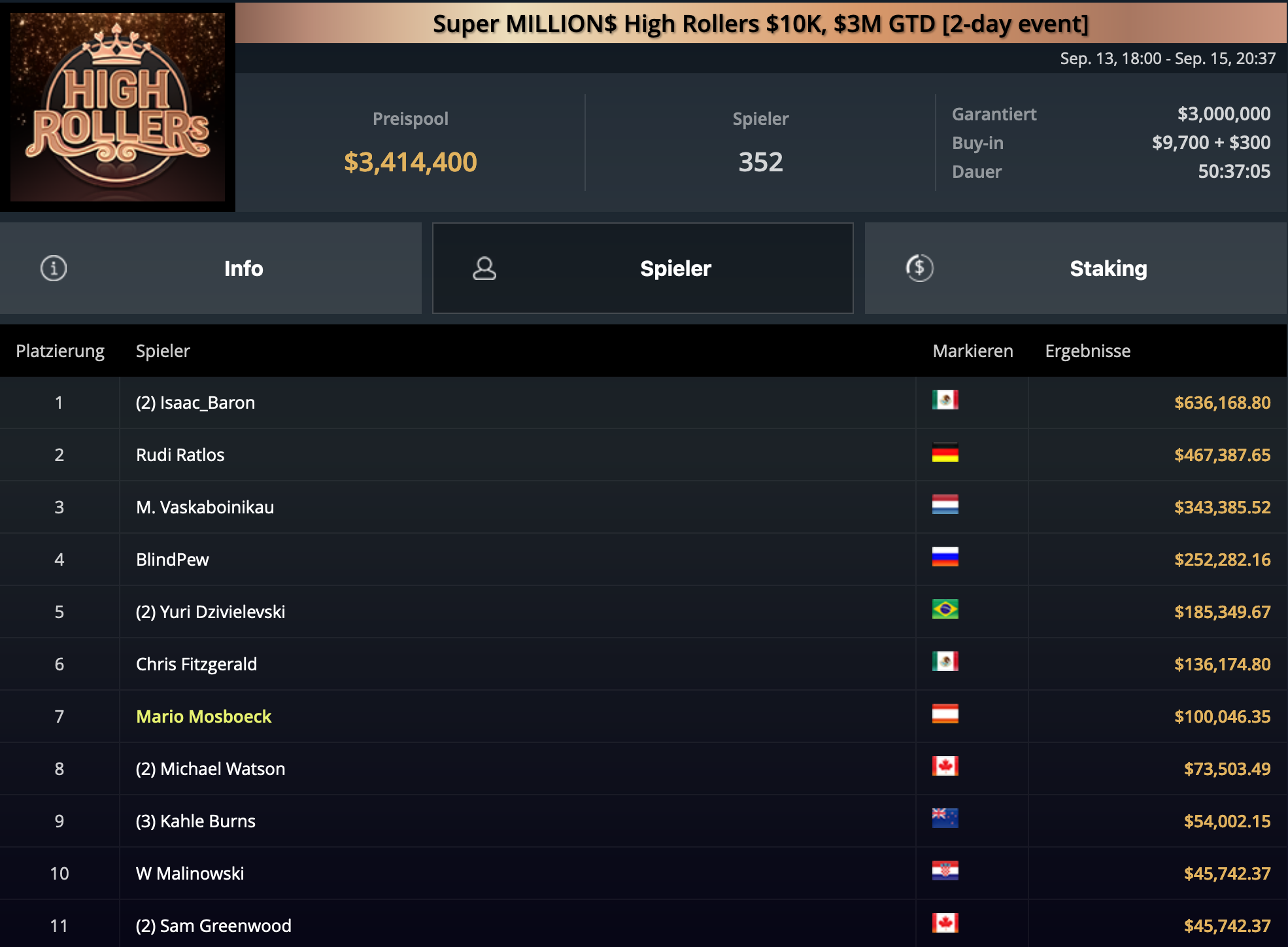 Mario Mösbock aus Österreich schaffte es an den Final Table, auch „Rudi Ratlos“ aus Deutschland war mit von der Partie. Mösbock musste auf Platz 7 an die virtuelle Rail, $100.046 blieben für ihn aus dem Preispool übrig.