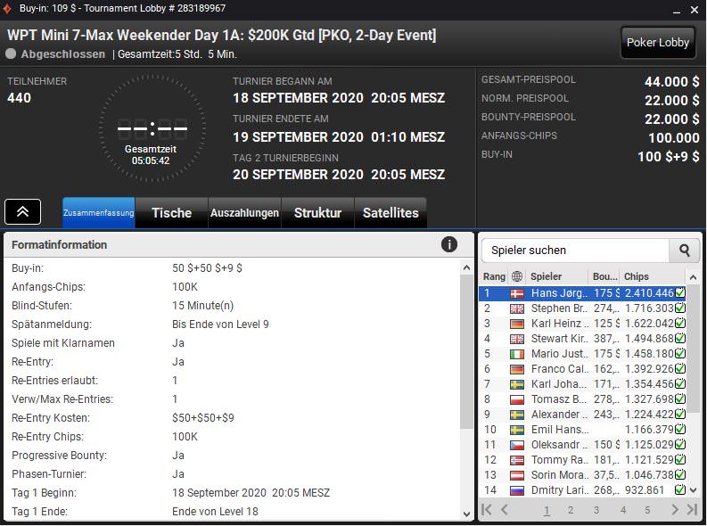 Mit 1.313 Spielern gab es das größte Teilnehmerfeld natürlich bei Day 1A des $11 WPT Micro 7-Max Weekender (PKO), das mit einem garantierten Preispool in Höhe von $50.000 ausgestattet ist. Die vorläufige Führung hat sich Louis Vieira aus Deutschland mit 2.256.238 Chips vor Erica Batista (2.963.508) aus Kanada erspielt. Einen sehr gute Auftakt hatte auch Michael Kuczka (1.946.413) als Siebter. Insgesamt haben 155 Spieler Spieltag 2 erreicht.