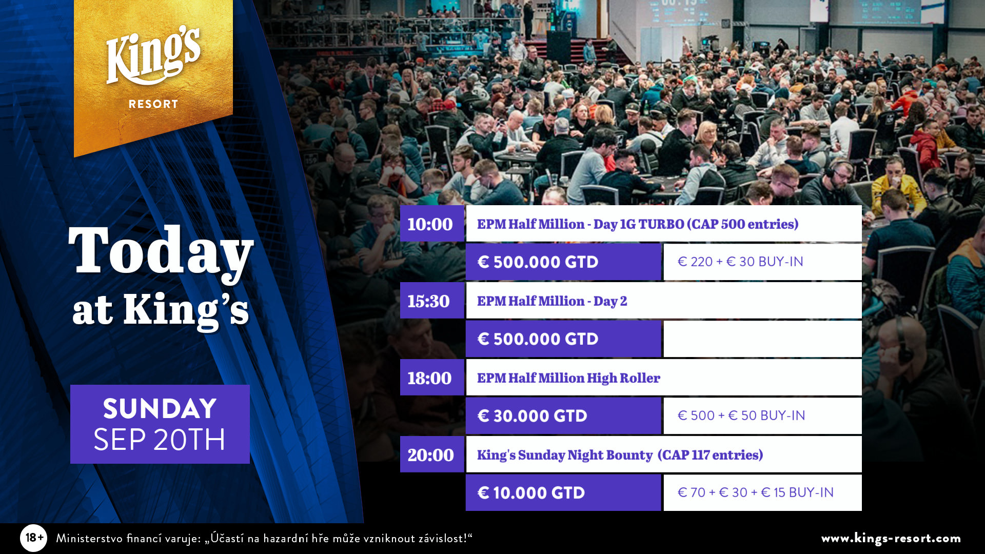 Außerdem starten heute um 18 Uhr noch der €500+50 EPM High Roller Event mit €30.000 GTD und um 20 Uhr das €70+30+15 King’s Sunday Night Bounty €10.000 GTD (CAP 117 Entries).
