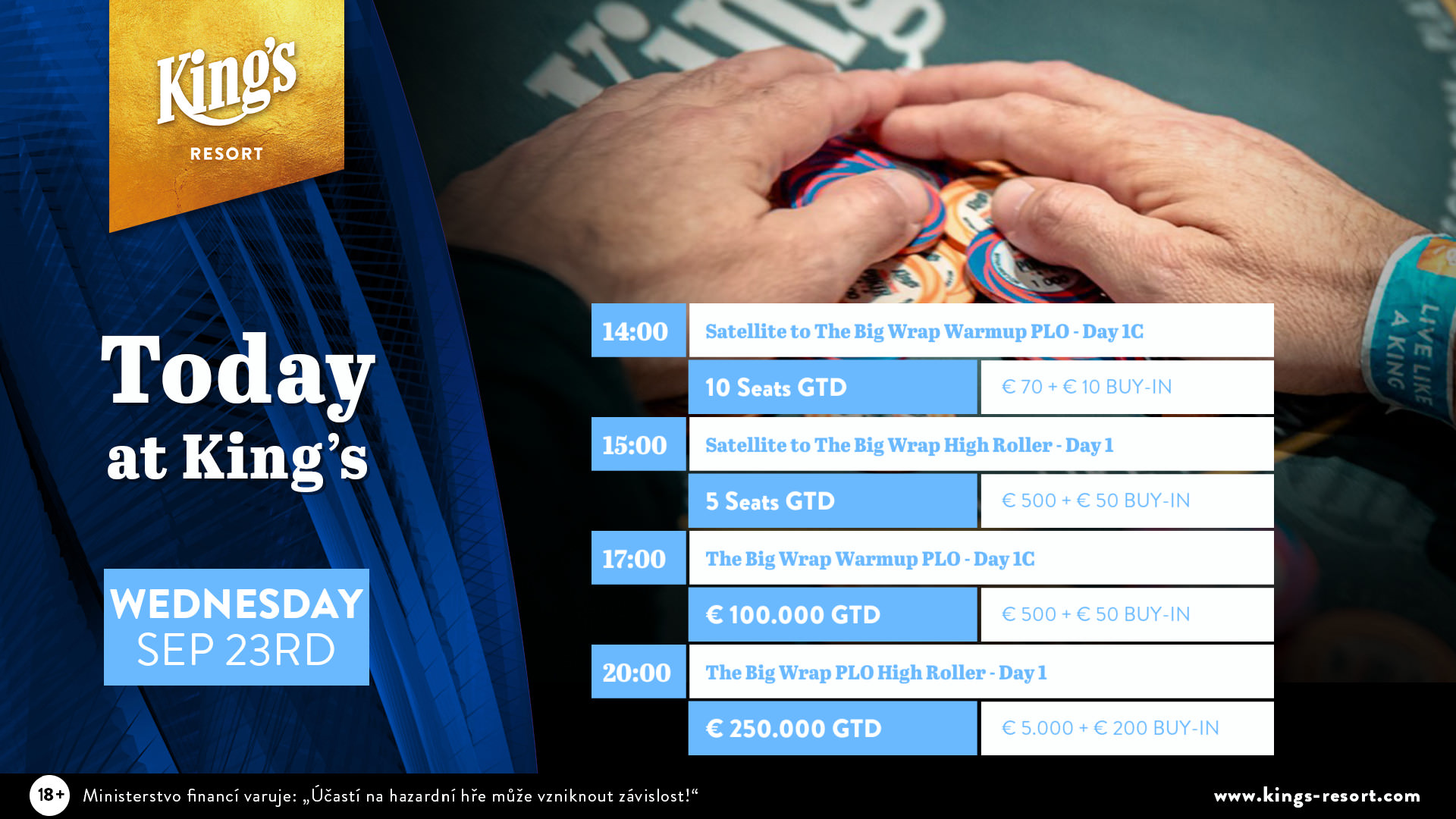 Heute gibt es im King’s Resort jede Menge PLO-Action. Los geht es um 14:00 Uhr mit einem Satellite für das Big Wrap Warm Up. Für €70+10 gibt es dort 10 Seats garantiert für den Startflight, der um 17:00 Uhr beginnt. Dort können sich die Spieler auch direkt für €500+50 einkaufen. €100.000 Garantie wartet auf die Spieler.