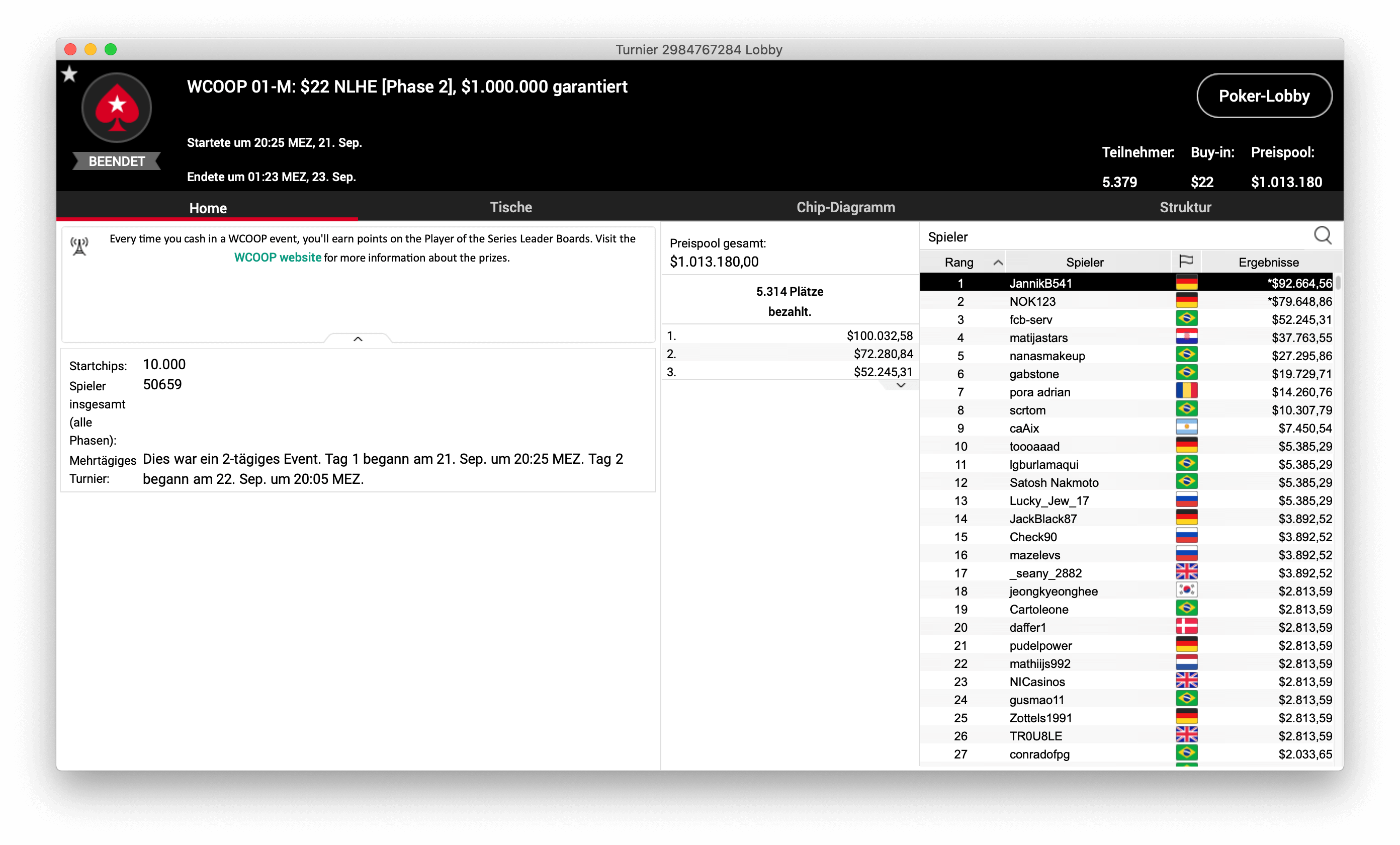 Beim WCOOP 01-M konnte sich der Deutsche „JannikB541“ vor seinem Landsmann „NOK123“ durchsetzen. Das Turnier hatte 5.379 Entries für $22, womit der Preispool bei $1.013.180 lag. Es gab einen Heads Up-Deal, der „JannikB541“ schlussendlich $92.664 zusprach. Runner-Up „NOK123“ ging mit $79.648 aus dem Turnier.