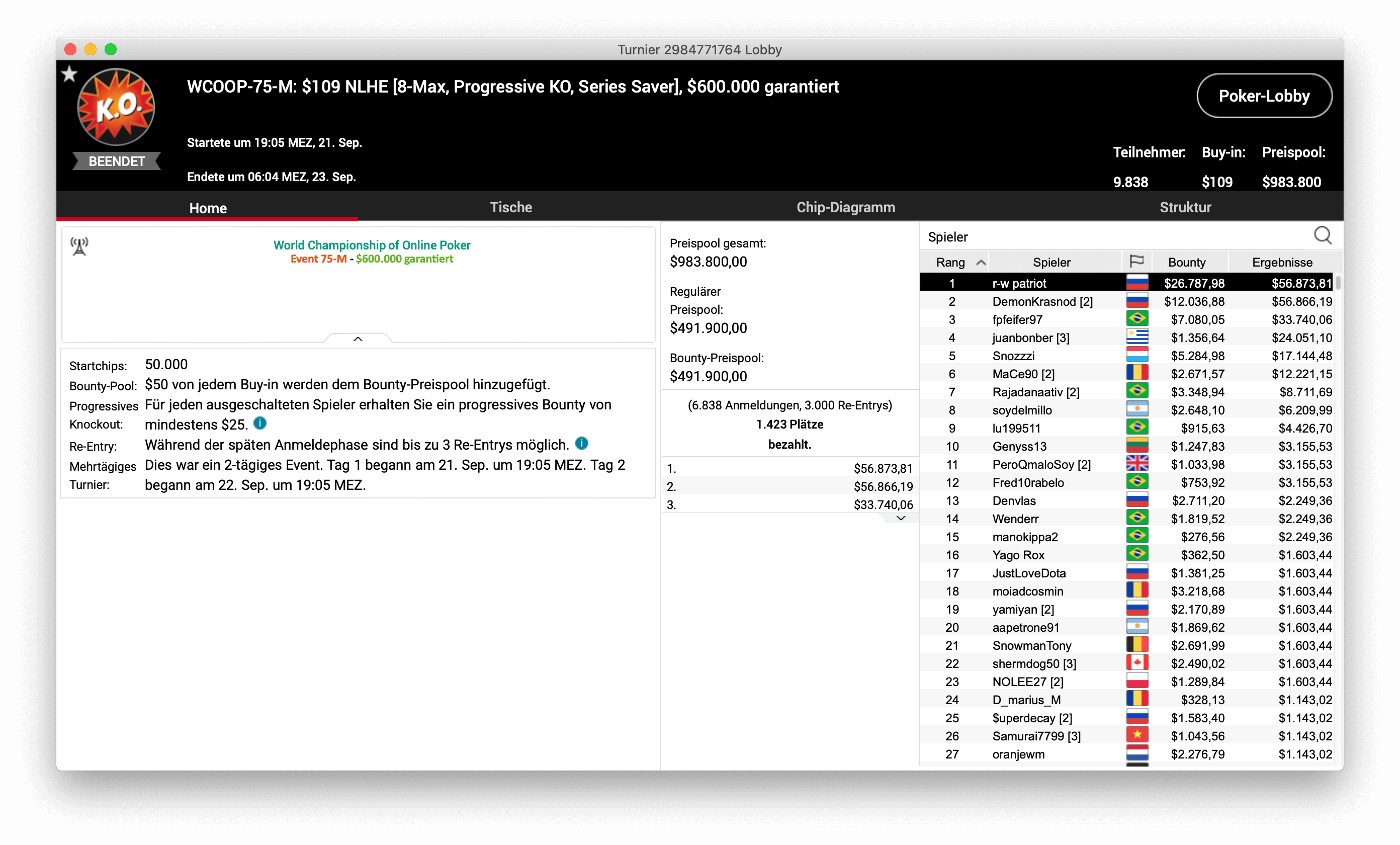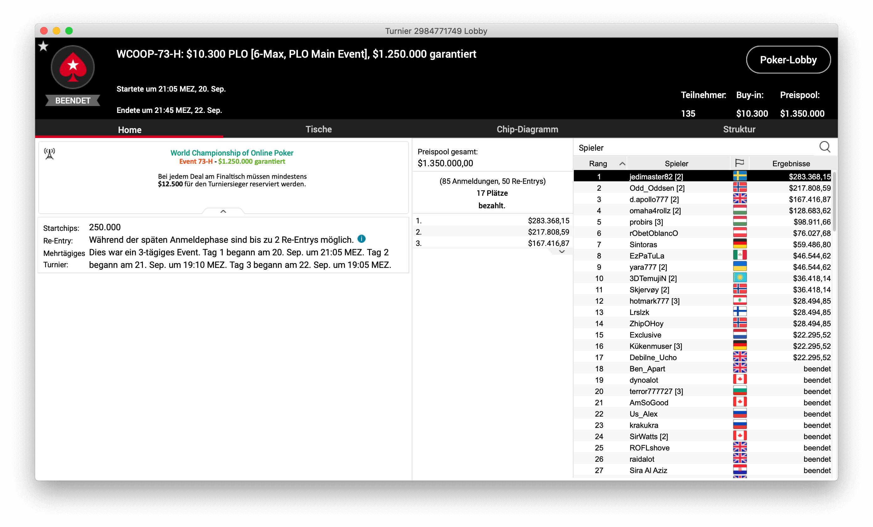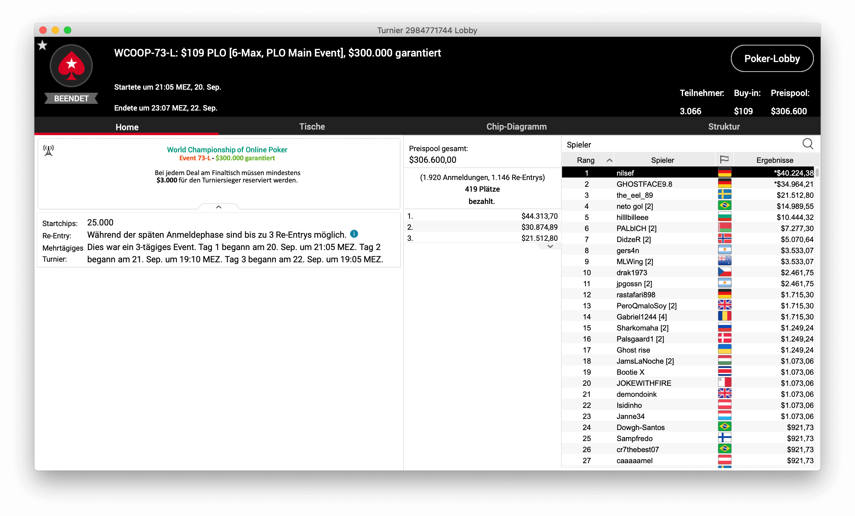 Ebenfalls nach einem Deal wurde Event 73-L der WCOOP, das 6-Max PLO Main Event mit $109-Buy-In, entschieden. Der deutsche Regular „nilsef“ schnappte sich den Sieg für $40.224. Er dealte mit „GHOSTFACE9.8“, der als Runner-Up $34.964 einsacken konnte.