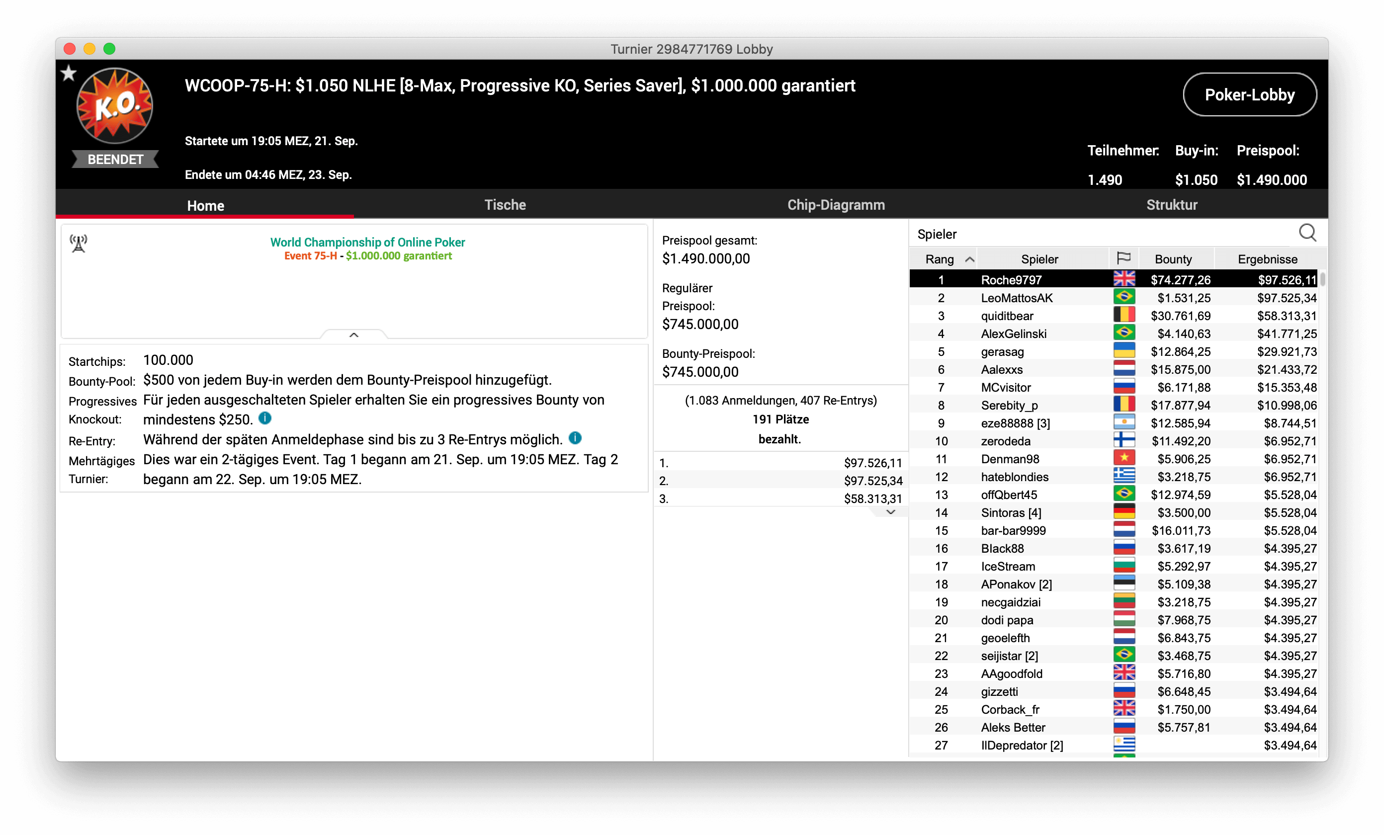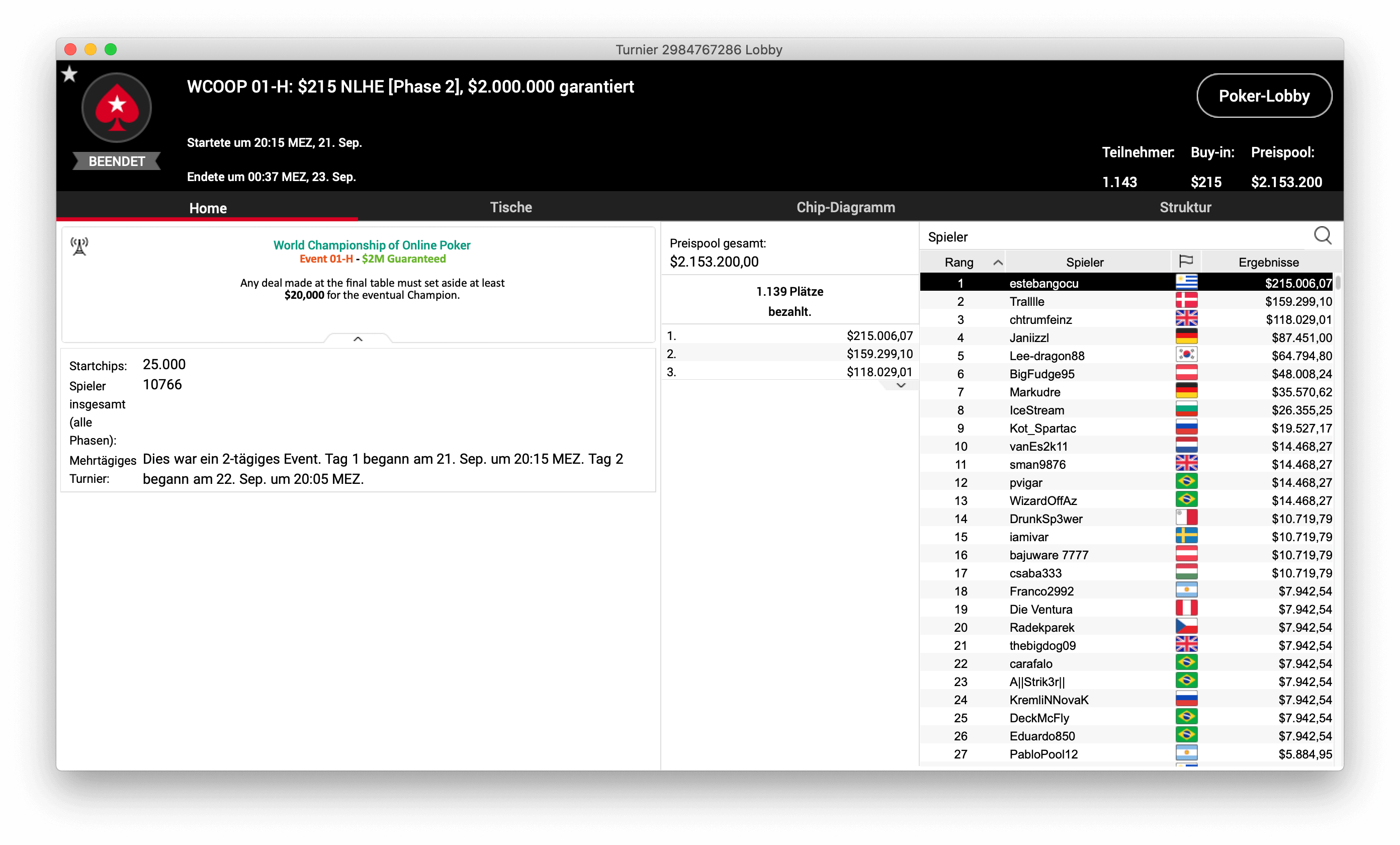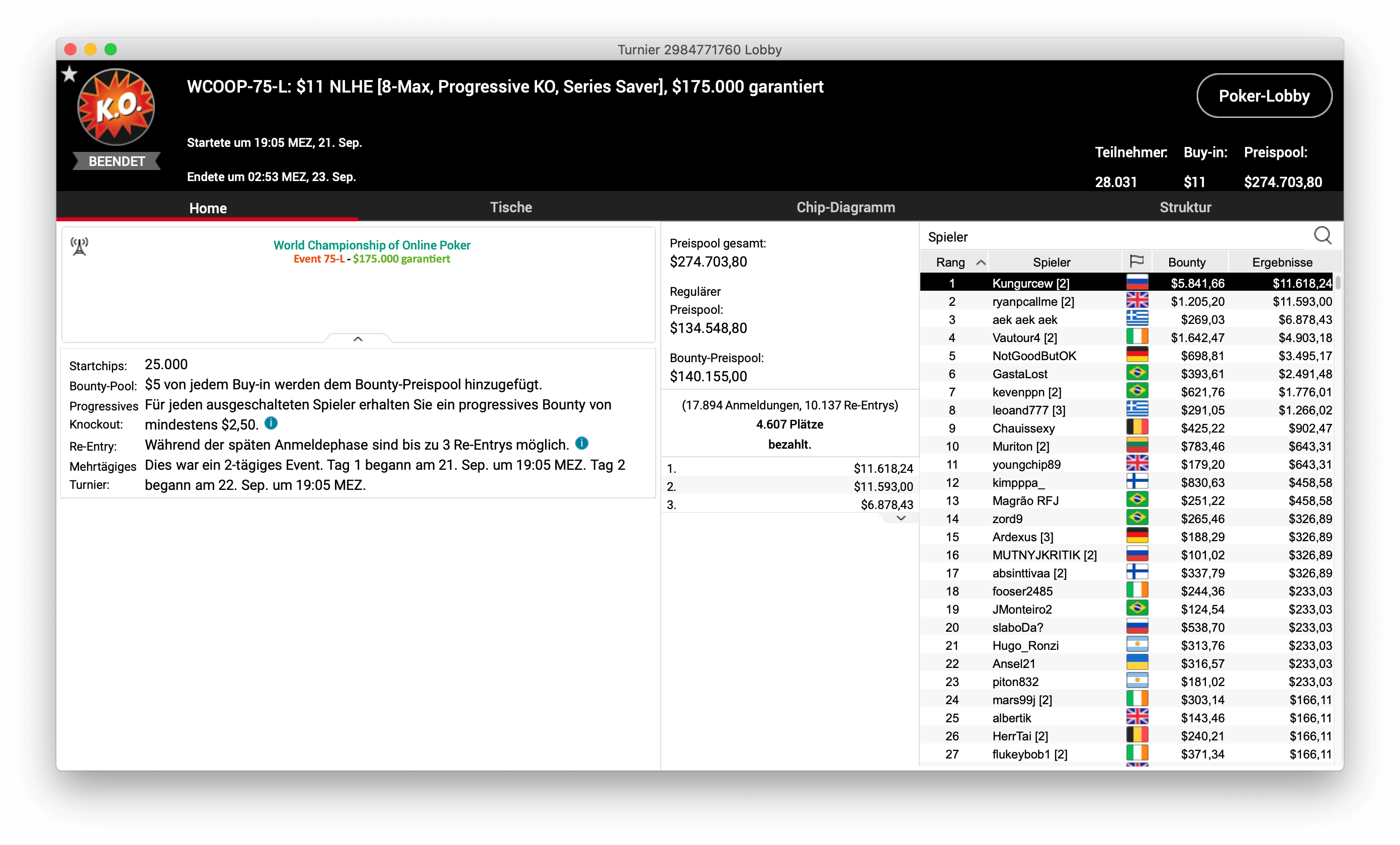 Ebenfalls nach einem Deal wurde Event 73-L der WCOOP, das 6-Max PLO Main Event mit $109-Buy-In, entschieden. Der deutsche Regular „nilsef“ schnappte sich den Sieg für $40.224. Er dealte mit „GHOSTFACE9.8“, der als Runner-Up $34.964 einsacken konnte.