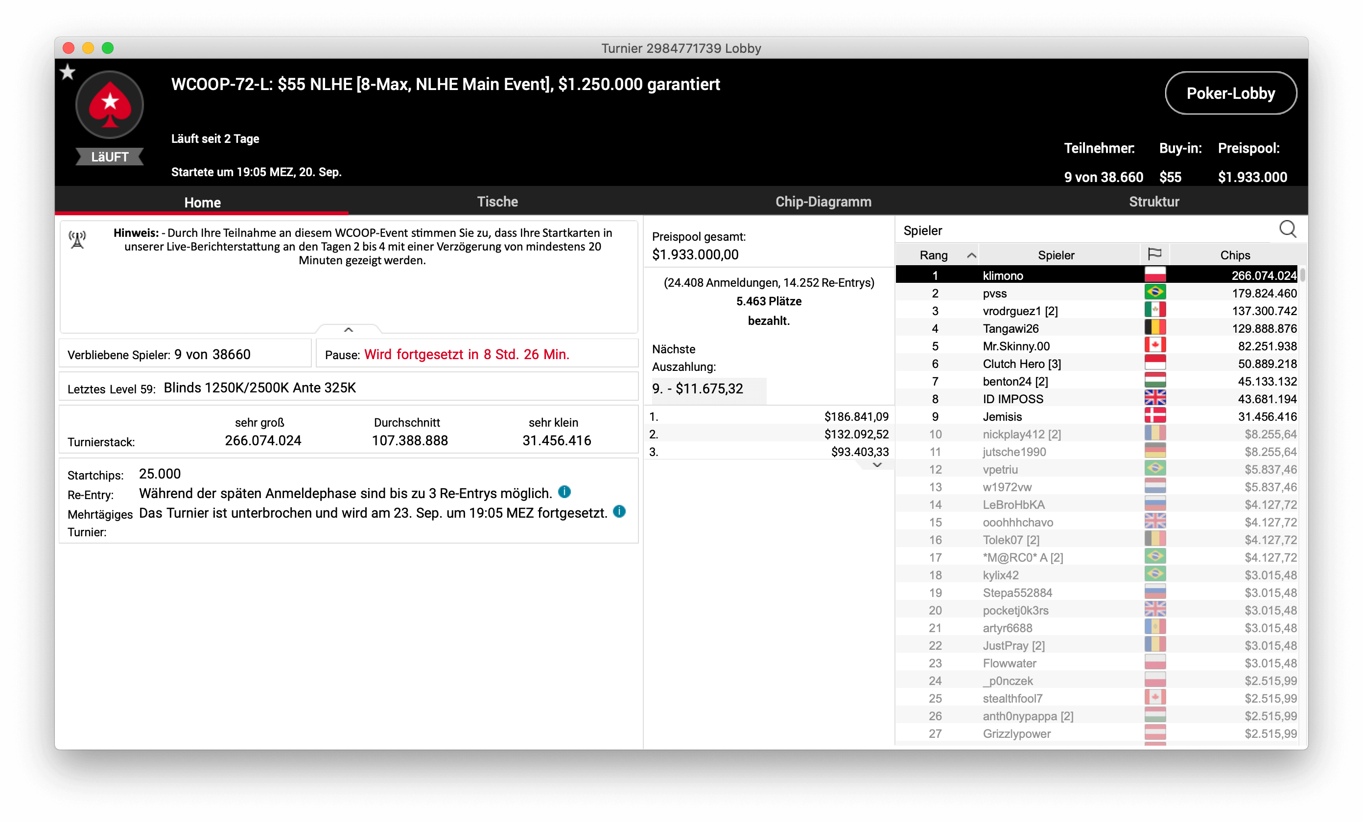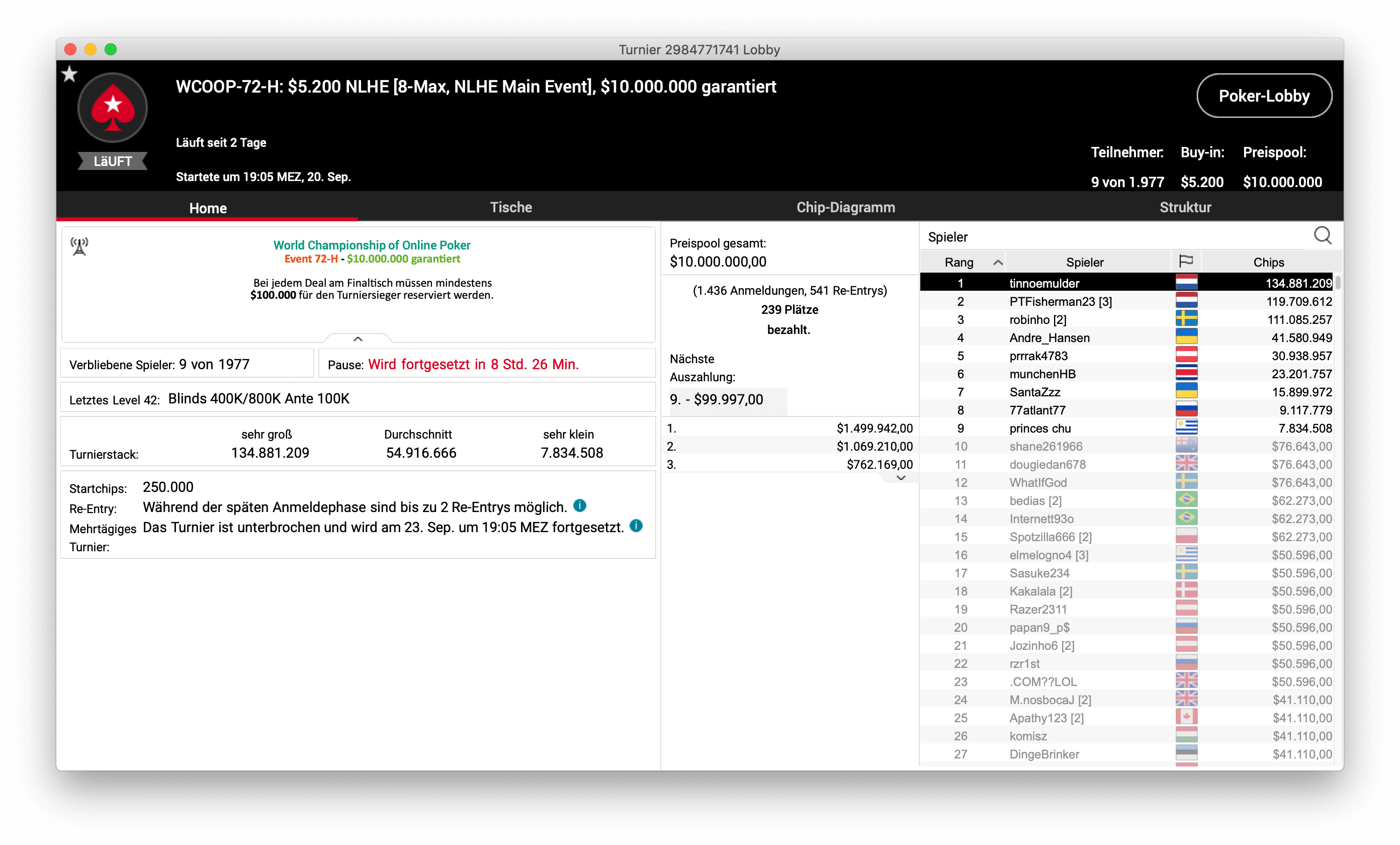 Beim gr0ßen $5.200 Main Event der WCOOP sind nur noch 9 Spieler von 1.977 Entries übrig. Nun geht es ans Eingemachte, die vorderen Geldränge des $10.000.000 Preispools stehen noch aus. Auf den Sieger warten $1,5 Mio. Teun „tinnoemulder“ Mulder führt das Feld mit 134 Mio Chips an. Dahinter wartet „PTFisherman23“ alias Andre Marques und Robin „robinho“ Ylitalo mit 119 Mio und 111 Mio Chips auf ihre Chance. Aus unseren Breitengraden ist Tonio „prrrak4783“ Röder noch mit dabei, er hat auf Platz 5 knapp 31 Mio Chips. Die Entscheidung gibt es um 19:05 Uhr.