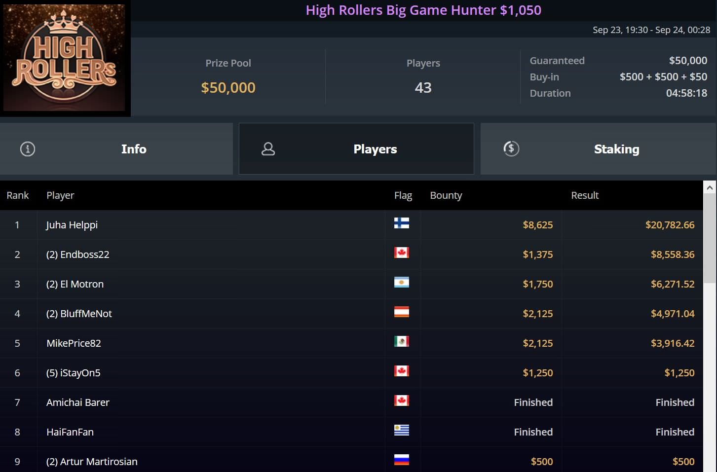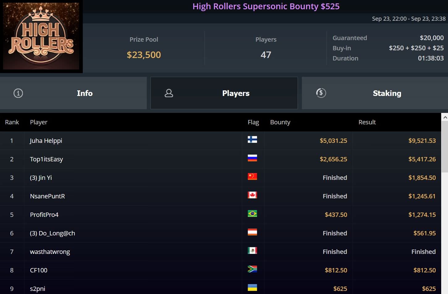 Helppi siegte erst beim $1.050 High Rollers Big Game Hunter und schlug dann beim $525 Supersonic Bounty gleich nochmal zu.
