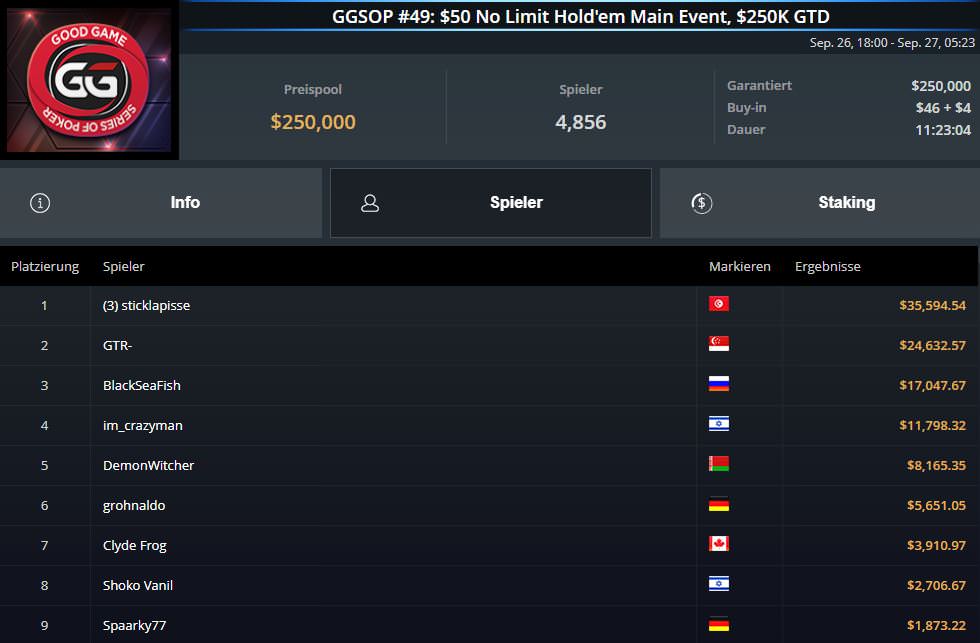 Bei der Good Game Series of Poker (GGSOP) auf GGPoker gibt es einen weiteren Turniersieg für einen Pokerspieler aus Deutschland zu vermelden. Auch bei den regulären Tagesturnieren waren die Teilnehmer aus dem deutschsprachigen wieder erfolgreich unterwegs.