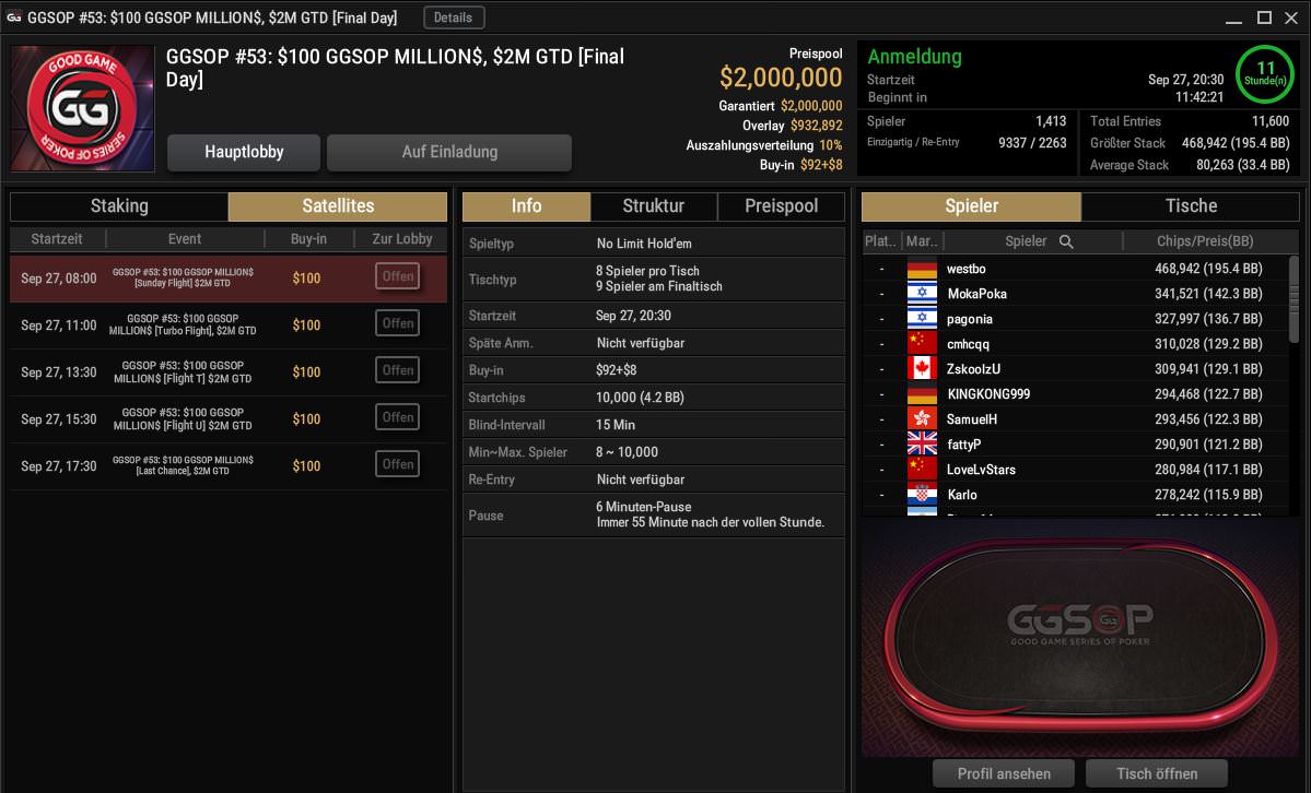 Heute findet die GGSOP ihren Abschluss und es wird noch einmal richtig interessant, insbesondere beim $100 GGSOP MILLION$ (53). Bei 15 von insgesamt 20 Startingflights wurden bisher nur 11.639 Entries erzielt und damit sind stand jetzt gerade einmal etwas mehr als die Hälfte der garantierten $2 Millionen an Preisgeldern abgedeckt. Da heute Sonntag ist, werden die letzten Flight sicher gut besucht sein, dennoch droht hier ein massives Overlay, das viel entsprechend extra Value für die Teilnehmer verspricht.