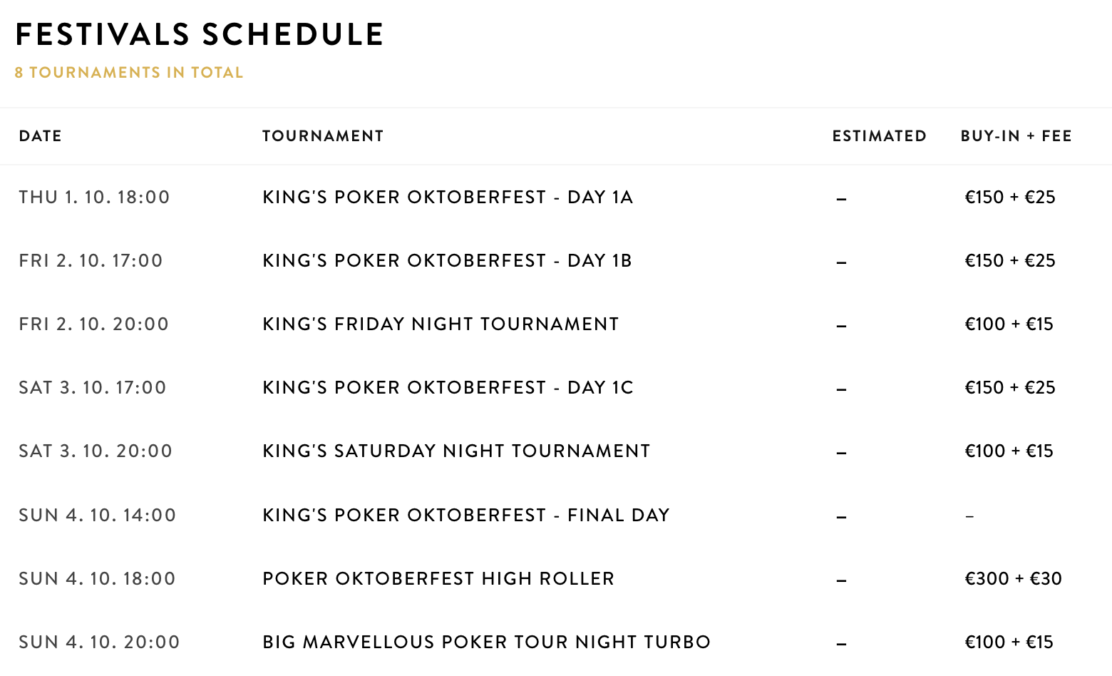 Los geht es am 01.10. um 18:00 Uhr mit Tag 1a des Poker Oktoberfest mit €150+25 Buy-In, am Freitag sowie am Samstag gibt es jeweils um 17:00 Uhr zwei weitere Startflights, bevor es dann am Sonntag in den Finaltag geht.