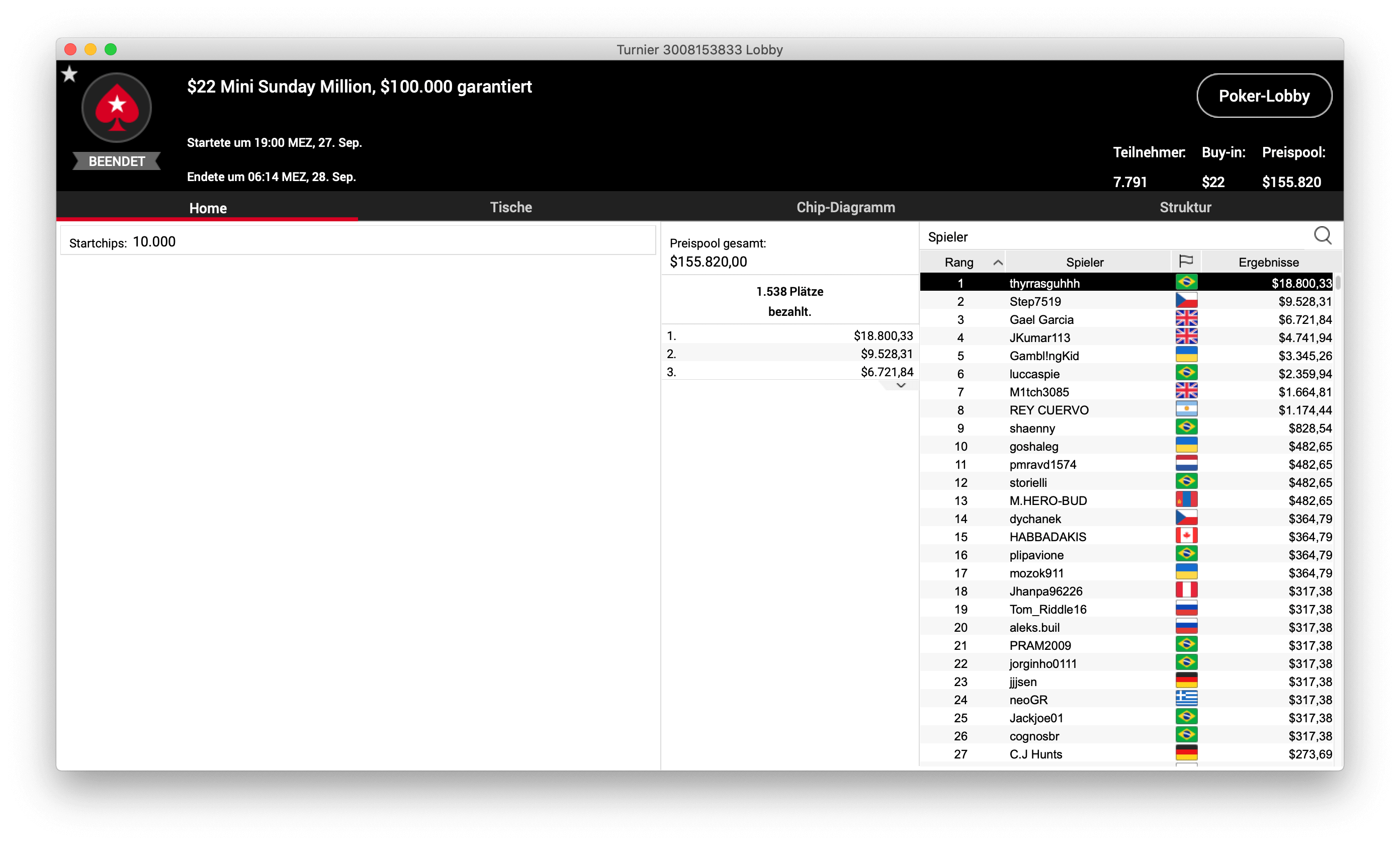 Die Sunday Million und das Mini Sunday Million auf PokerStars haben gestern ihren Sieger gefunden. Dabei konnte ein Spieler, der bereits bei der SCOOP groß cashen konnte, den Sieg erringen. „tzini9“ gewann die Sunday Million von letztem Sonntag.