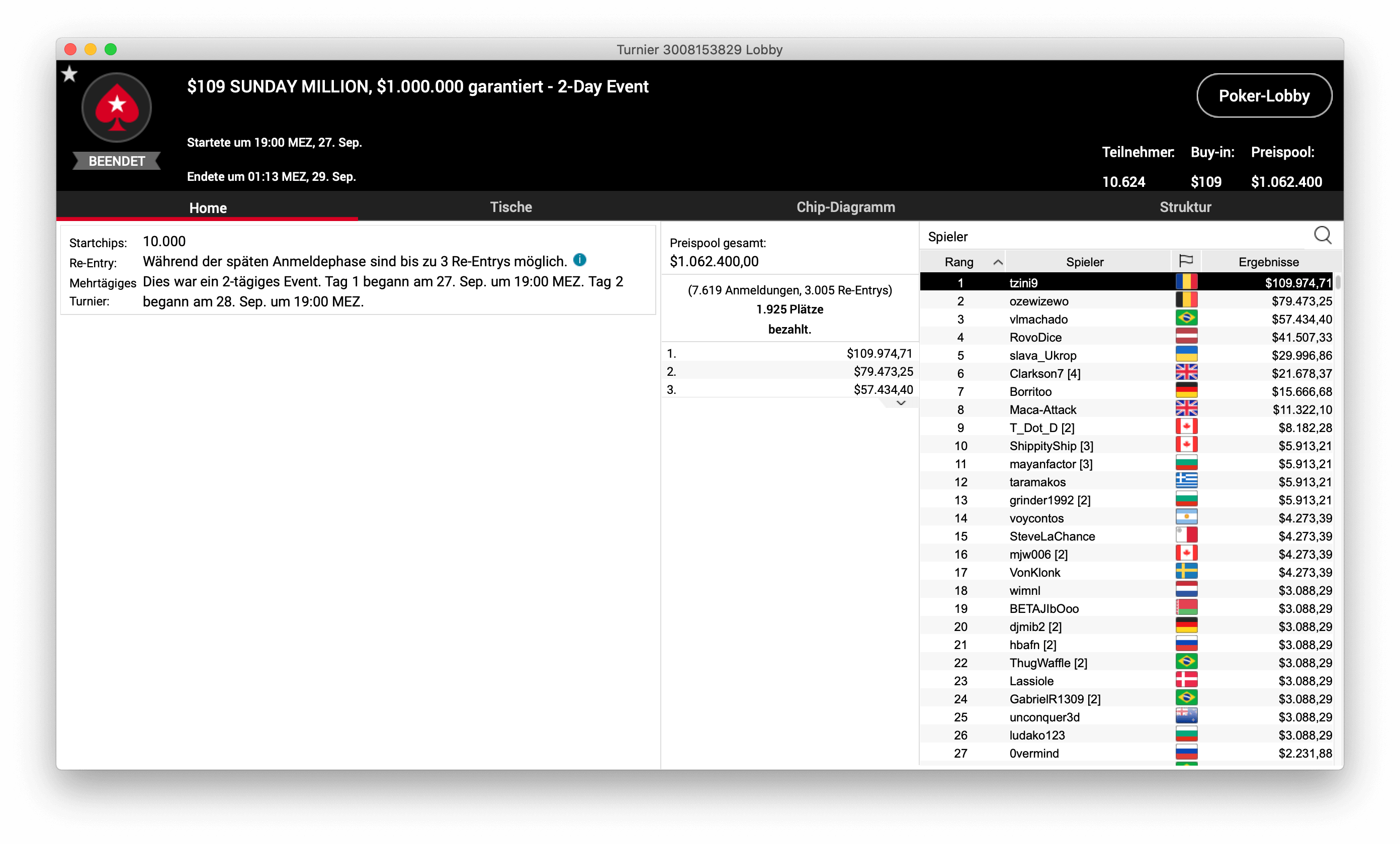 10.624 Entries kamen am Sonntag von 7.619 Spielern für das gewöhnliche $109 Buy-In zusammen. Der Preispool überkam die Millionen Dollar-Garantie um $62.400. „tzini9“ konnten das Turnier gewinnen. Der Rumäne casht zum zweiten Mal in kurzer Zeit groß. Er konnte im Main Event der vergangenen Scoop sich bereits auf Platz 6 für $92.868,38 spielen. Für den Sieg der Sunday Million gibt es $109.974,71 für den Spieler. Runner-Up wurde der Belgier „ozewizewo“ für $79.473,25. Bester DACH-Spieler wurde „RovoDice“ auf Rang 4 für $41.507,33.