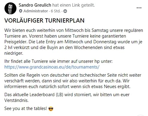 Allerdings werden weiterhin von Mittwochs bis Sonntags, jeweils vier One-Day Tournaments angeboten. Garantiesummen wird es erstmal nicht geben. Bei den Mittwochs- und Donnerstagsturnieren wurde die Late-Registration um zwei Level verkürzt. Außerdem wurden die Buy-Ins am Wochenende etwas gesenkt.