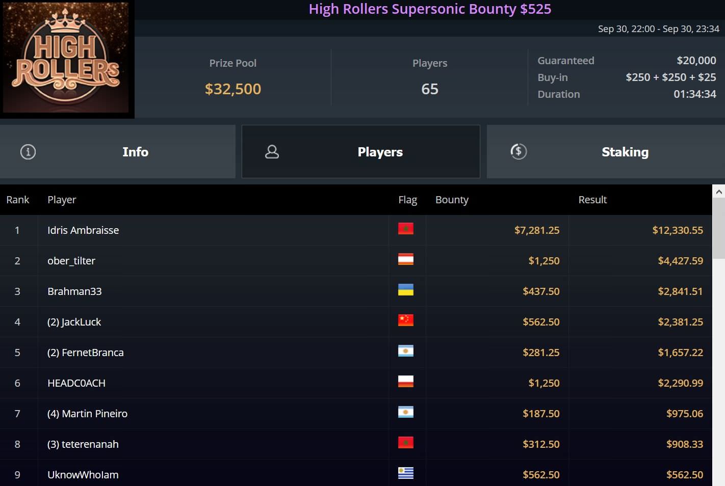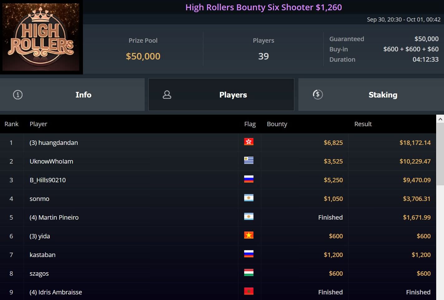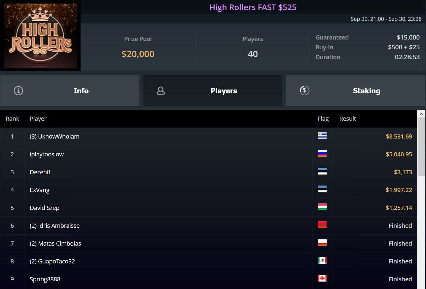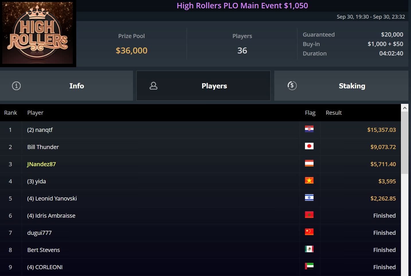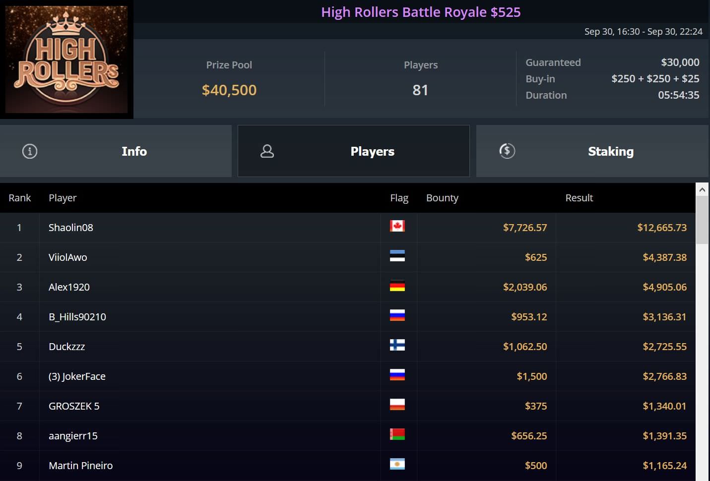 Weitere Spitzenergebnisse aus deutschsprachiger Sicht gab es beim $525 High Rollers Battle Royale, wo „Alex1920“ Dritter wurde, und beim $525 High Rollers Supersonic Bounty, bei dem „ober_tilter“ aus Österreich den zweiten Platz belegte.