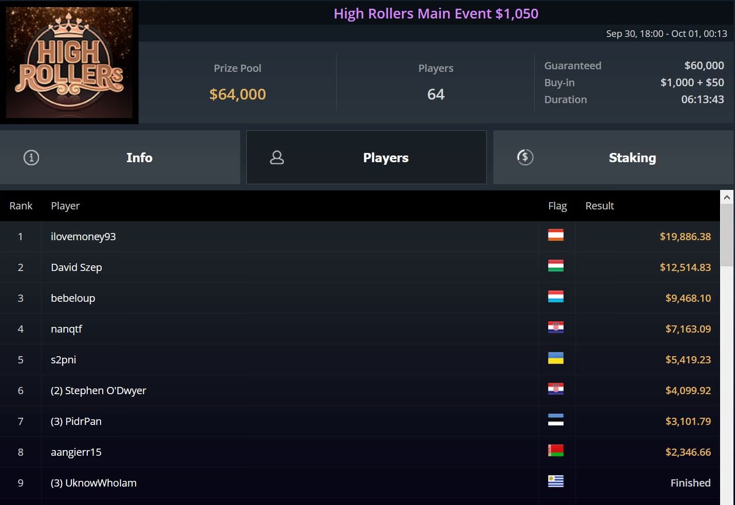 Das beste Ergebnis holte der in Österreich beheimatete „ilovemoney93“, der sich beim $1.050 High Rollers Main Event gegen 63 Konkurrenten durchsetzte und knapp $20.000 kassierte.