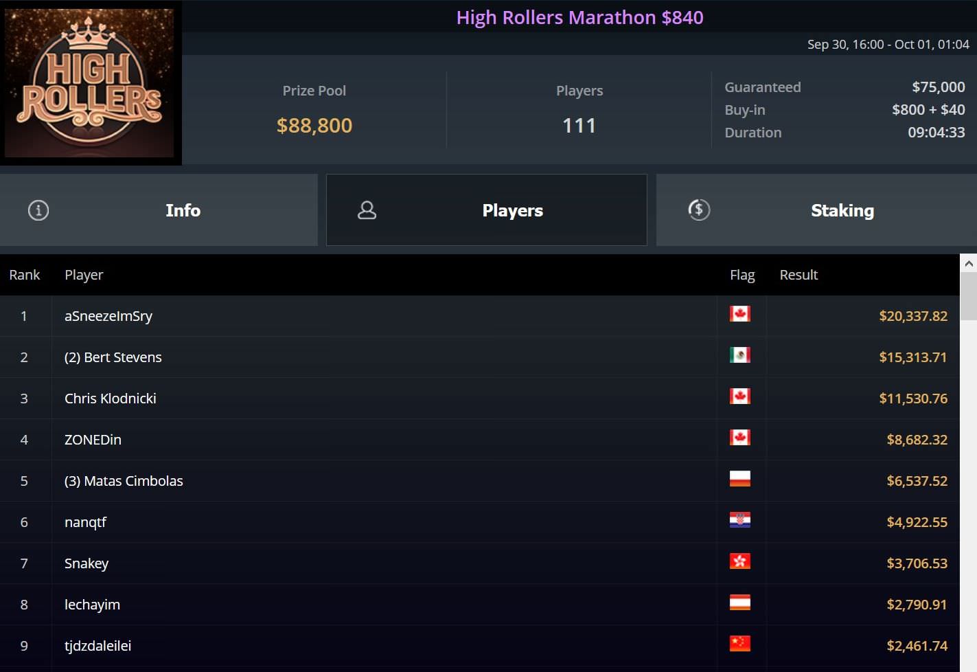 Damit war er aber „nur“ der zweitgrößte Gewinner des Tages, denn „aSneezeImSry“ aus Kanada erhielt für seinen Triumph beim $840 Marathon sogar über $20.000 Preisgeld.