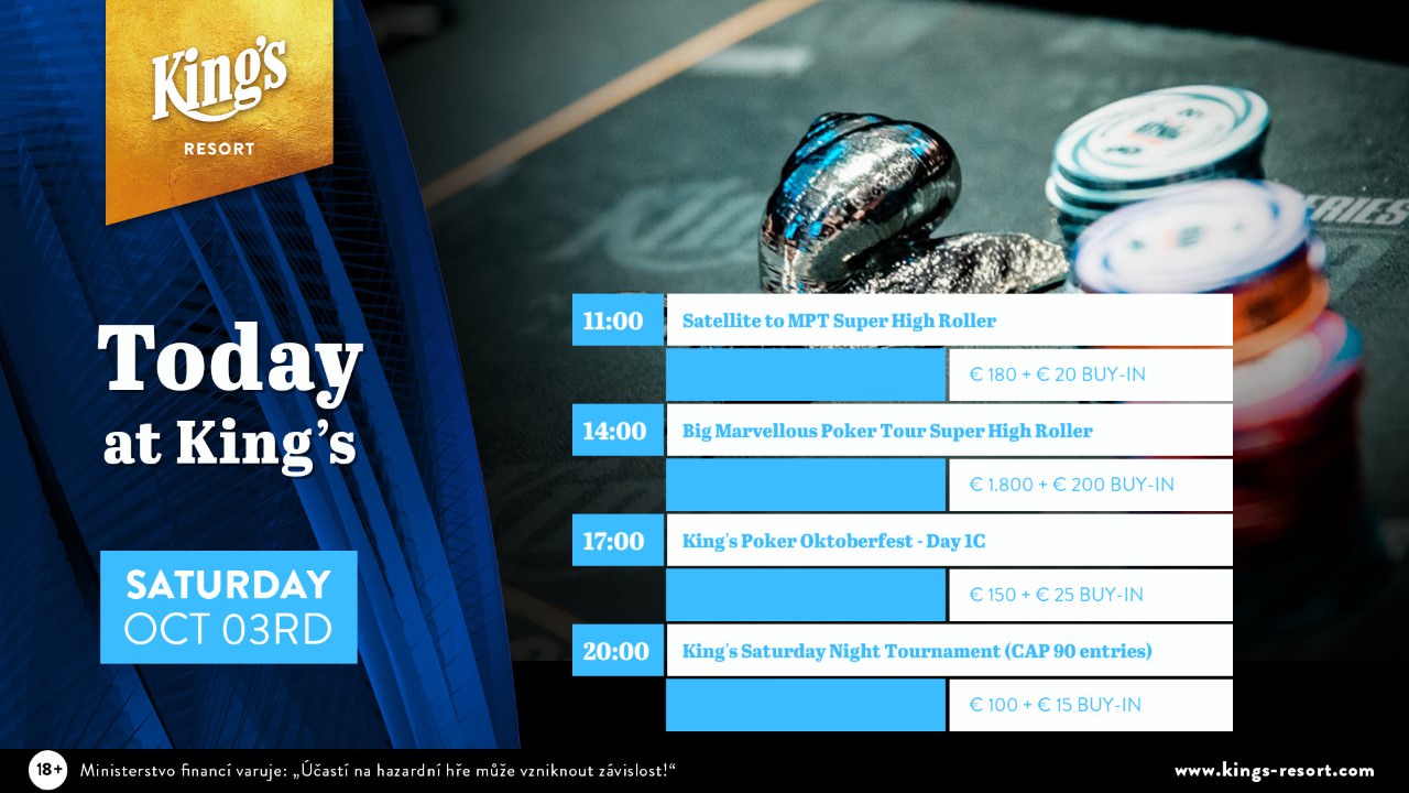 Heute steht ab 14 Uhr das €2.000 Super High Roller der BMPT auf dem Programm, außerdem wird um 17 Uhr der letzte Starttag des Oktoberfests und um 20 Uhr das King’s Saturday Night gestartet.