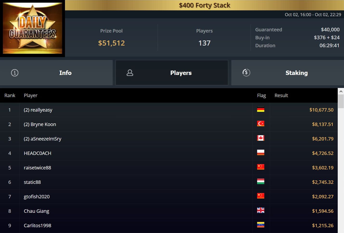 Das beste Ergebnis gelang dabei „reallyeasy“ aus Deutschland, der sich beim $400 Forty Stack gegen 136 Konkurrenten durchsetzte und über $10.000 gewann.