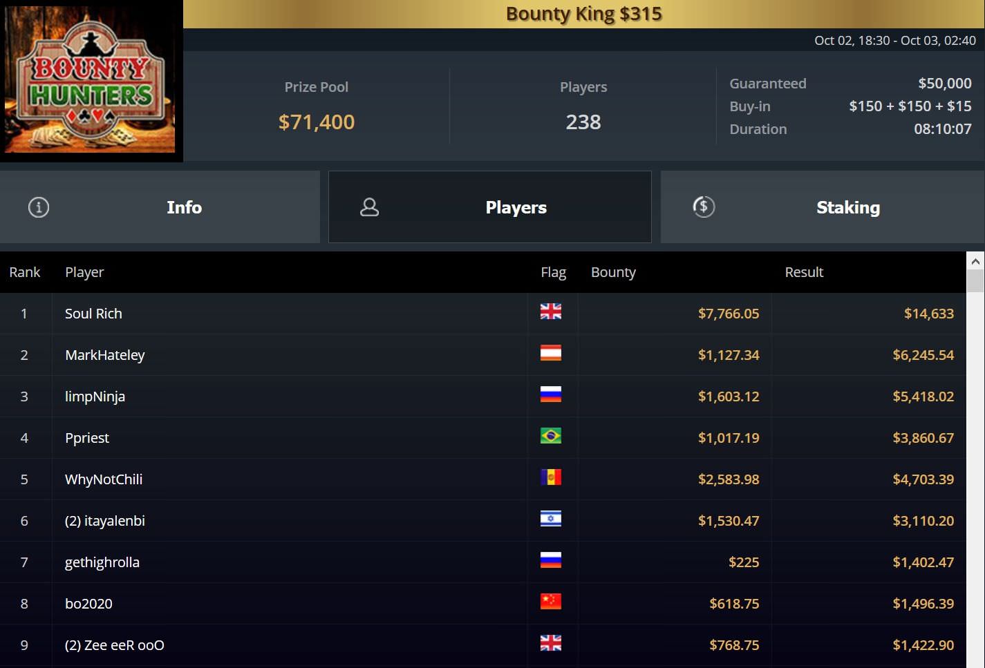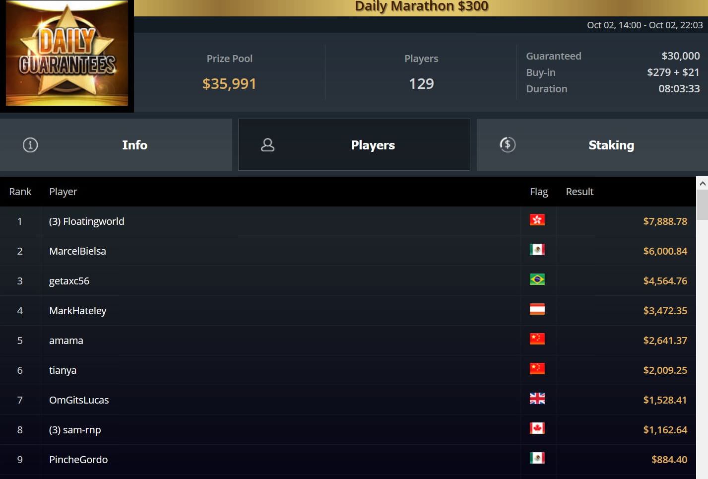 Er landete beim $315 Bounty King auf Platz 2 und beim $300 Daily Marathon Platz 4, was ihm in der Summe rund $11.000 an Preisgeldern einbrachte.