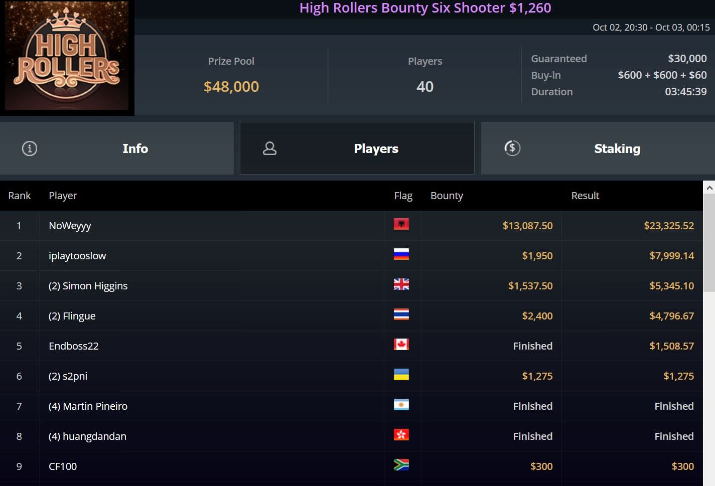 Größter Gewinner des Tages war aber der Albaner „NoWeyyy“, der sich beim $1.260 High Rollers Bounty Six Shooter den Sieg holte und über $36.000 abräumte.